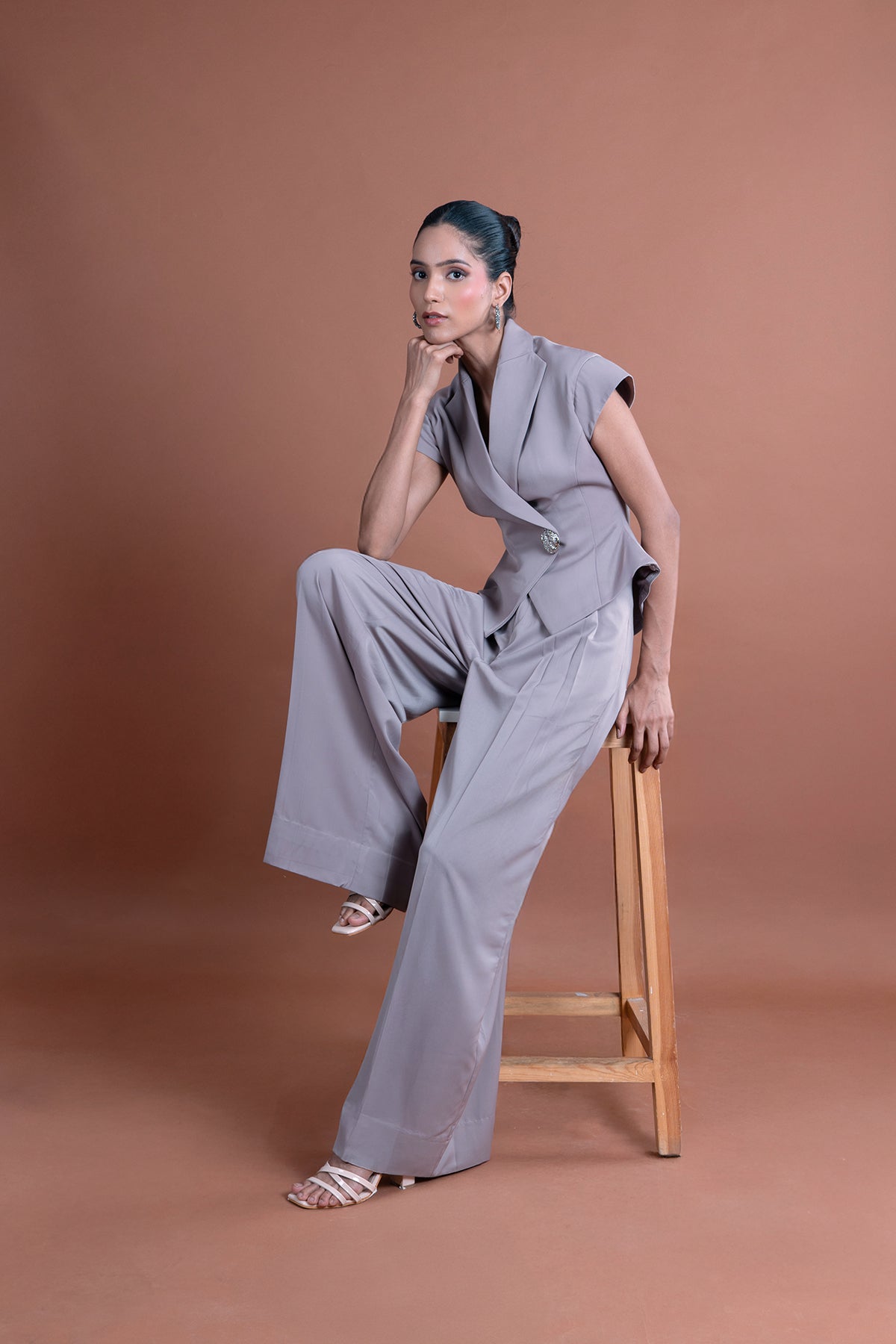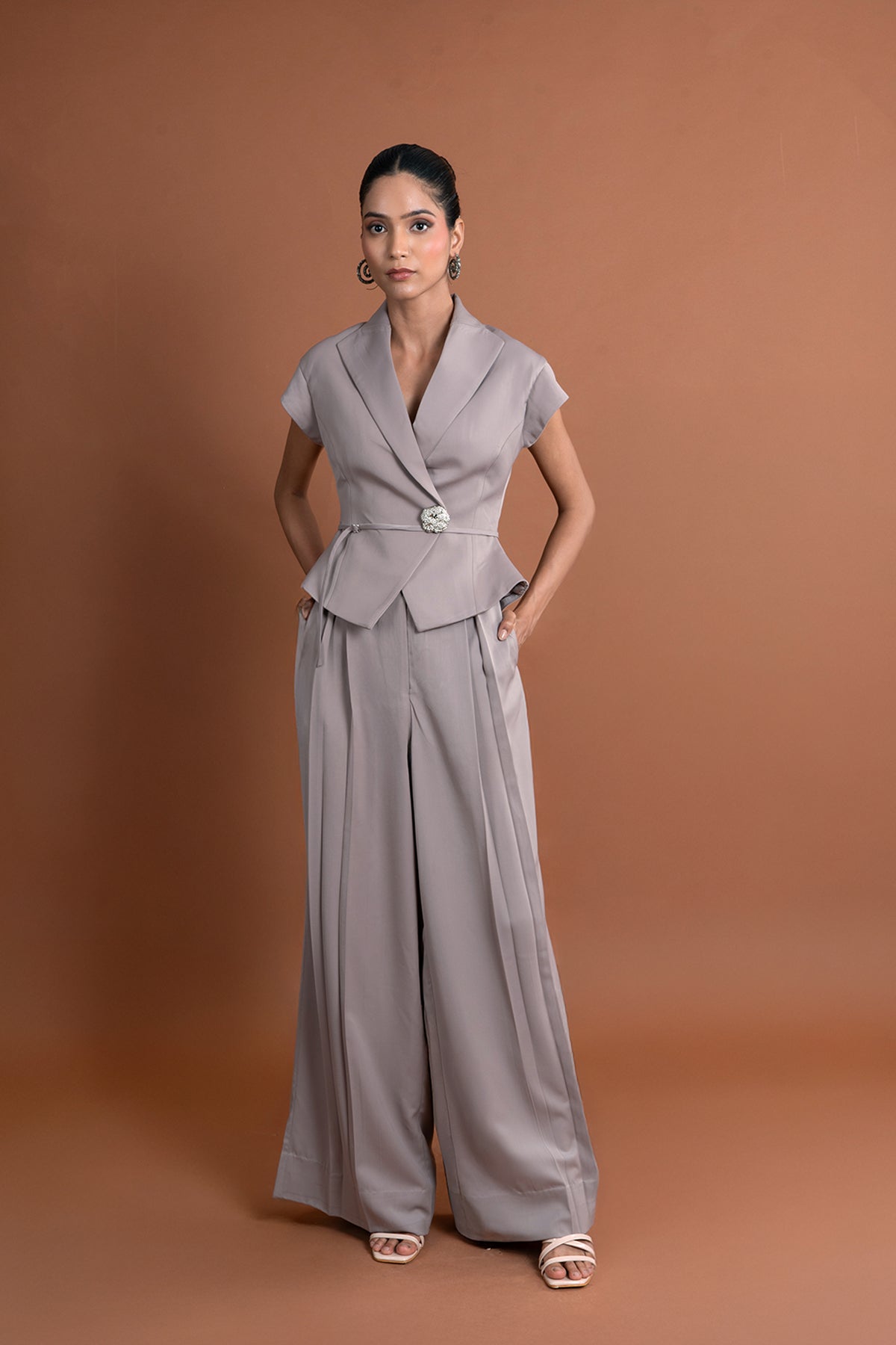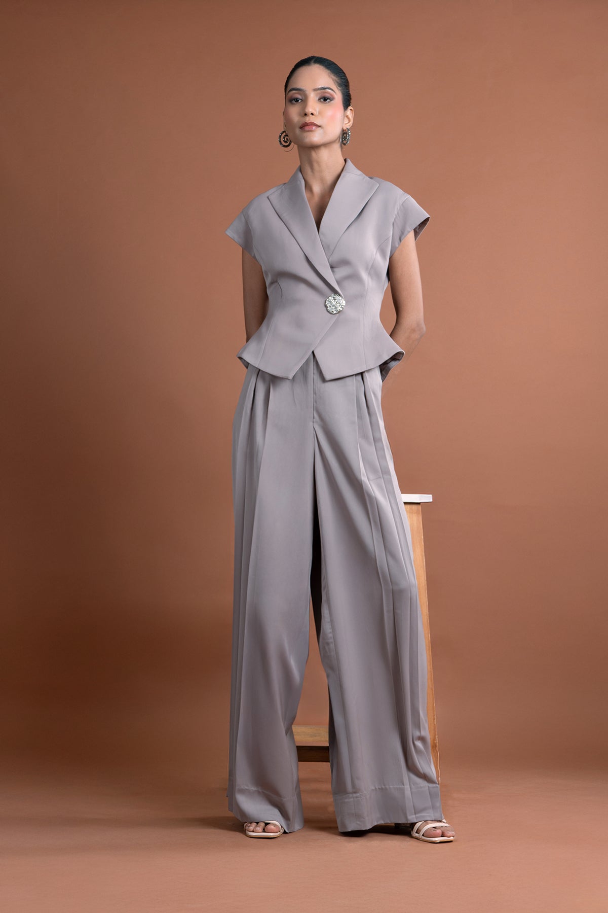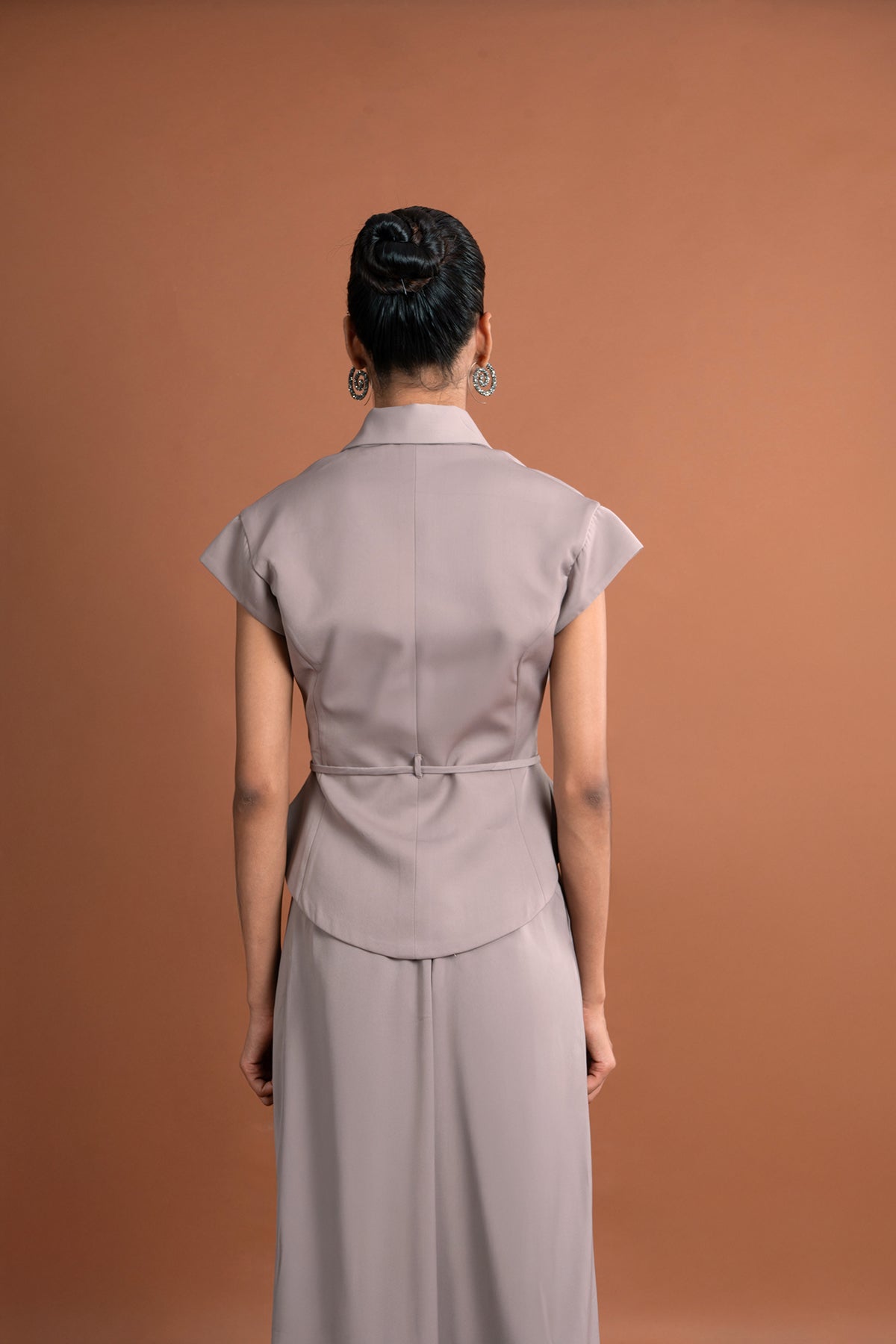 Tailored to perfection in poly twill crepe, the Solène Blazer is designed for the modern muse. Featuring a cape sleeve and vested wrap silhouette, it cinches gracefully at the waist with a statement antique silver bold button. In a soft neutral tone, it embodies quiet luxury — ideal for elevated daywear or a statement office-to-evening look.
