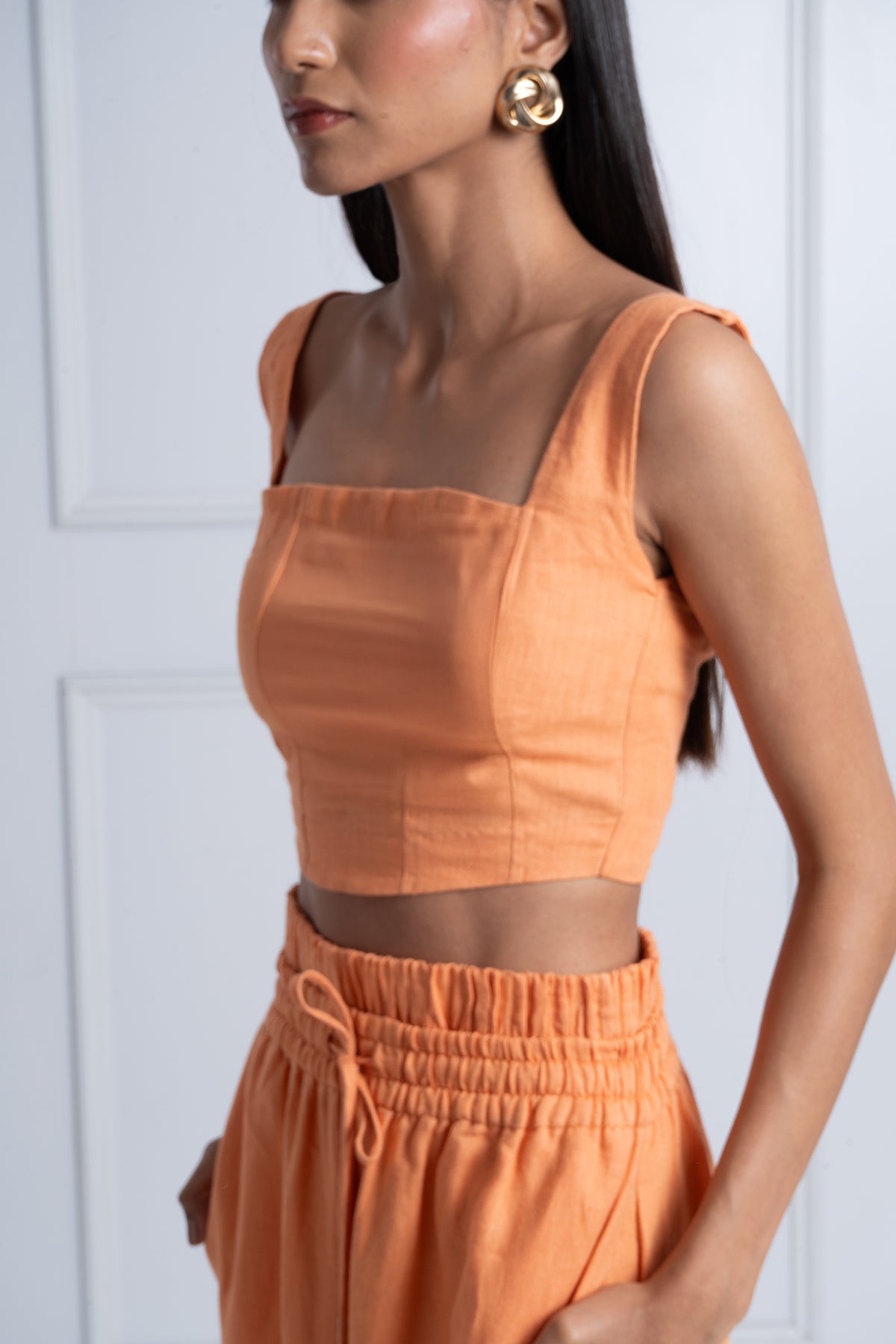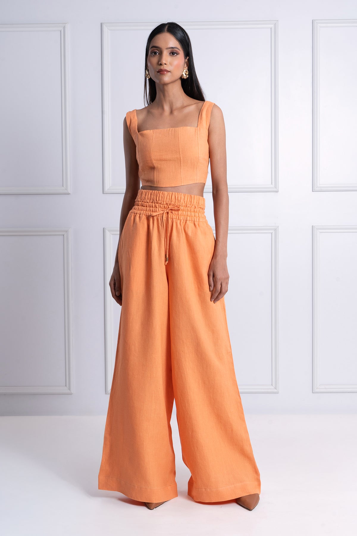 The Sol Set in its 2-piece version features a structured square-neck crop top and relaxed wide-leg trousers in pure linen. The drawstring waist adds comfort, while the bold tone brings instant edge. A summer hero piece that feels light but looks powerful.