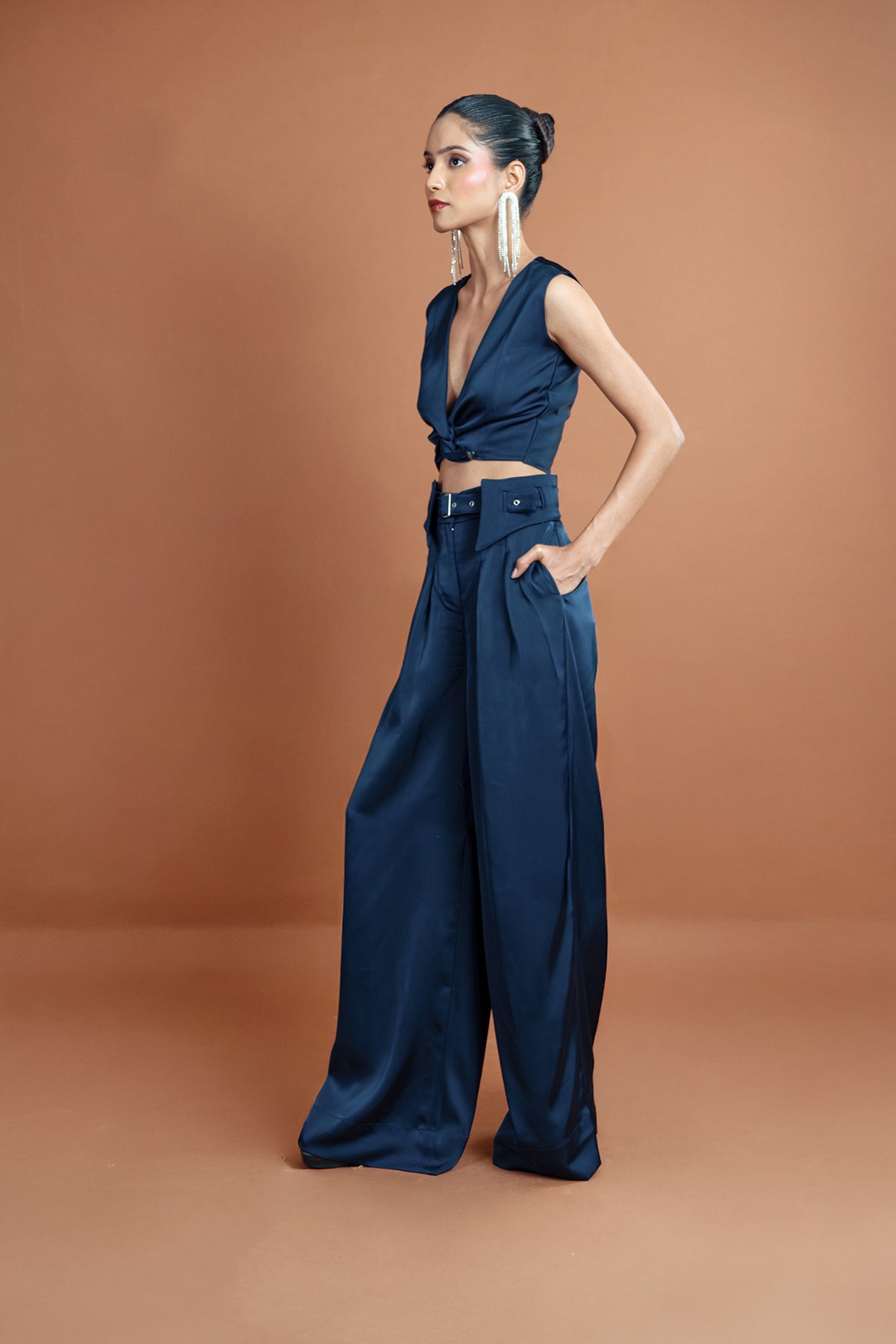 Command the room in the Midnight Edit. Cut in a rich navy satin, this co-ord features a knotted V-neck crop top that flatters the silhouette and a pair of wide-leg trousers with sharp pleats and a structured belt. Edgy yet elevated, it’s a versatile statement piece that transitions seamlessly from night to noir.