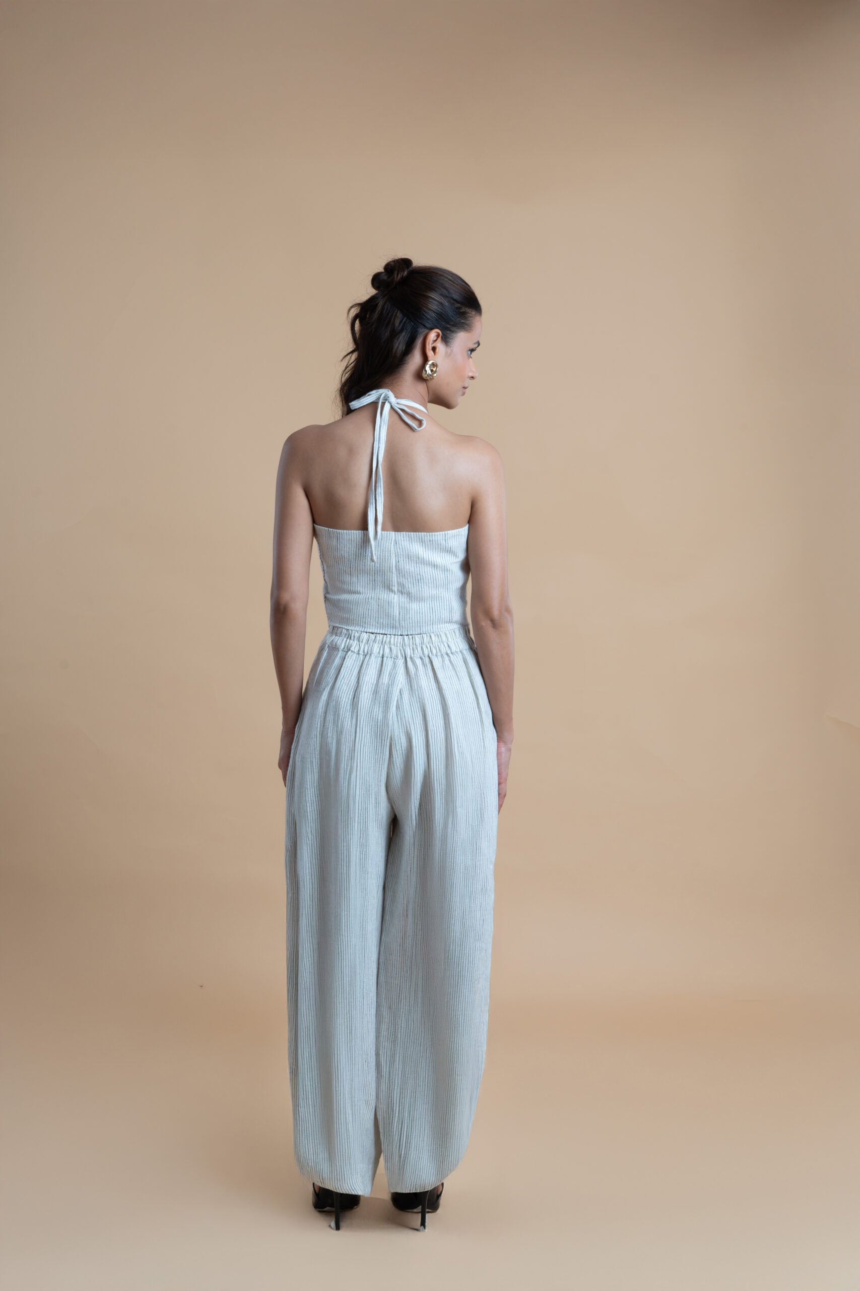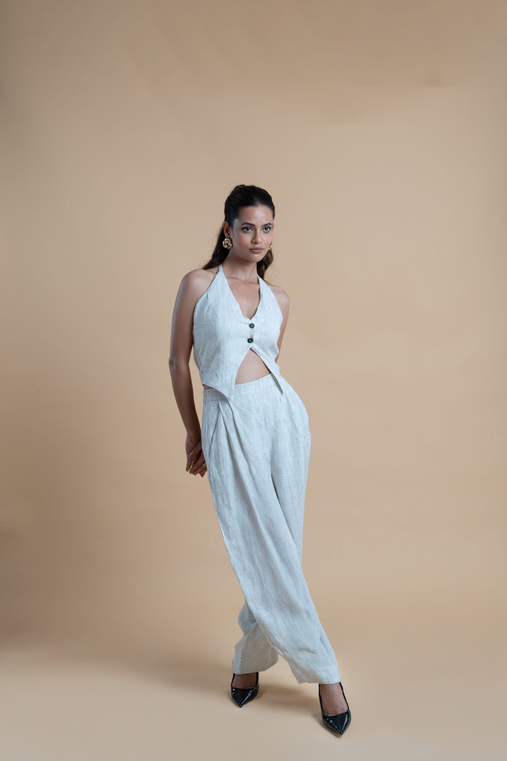 The Isla Set is your striped linen essential for refined summer days. Featuring a softly structured halter-neck top with a pointed hem and bold button detail, paired with barrel wide-leg pleated trousers that offer ease and movement. Cool, crisp, and uncomplicated — made for slow brunches, creative workdays, and golden hour plans.