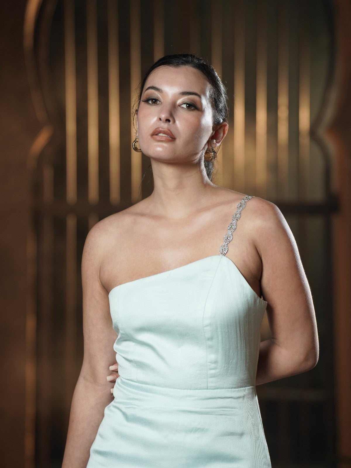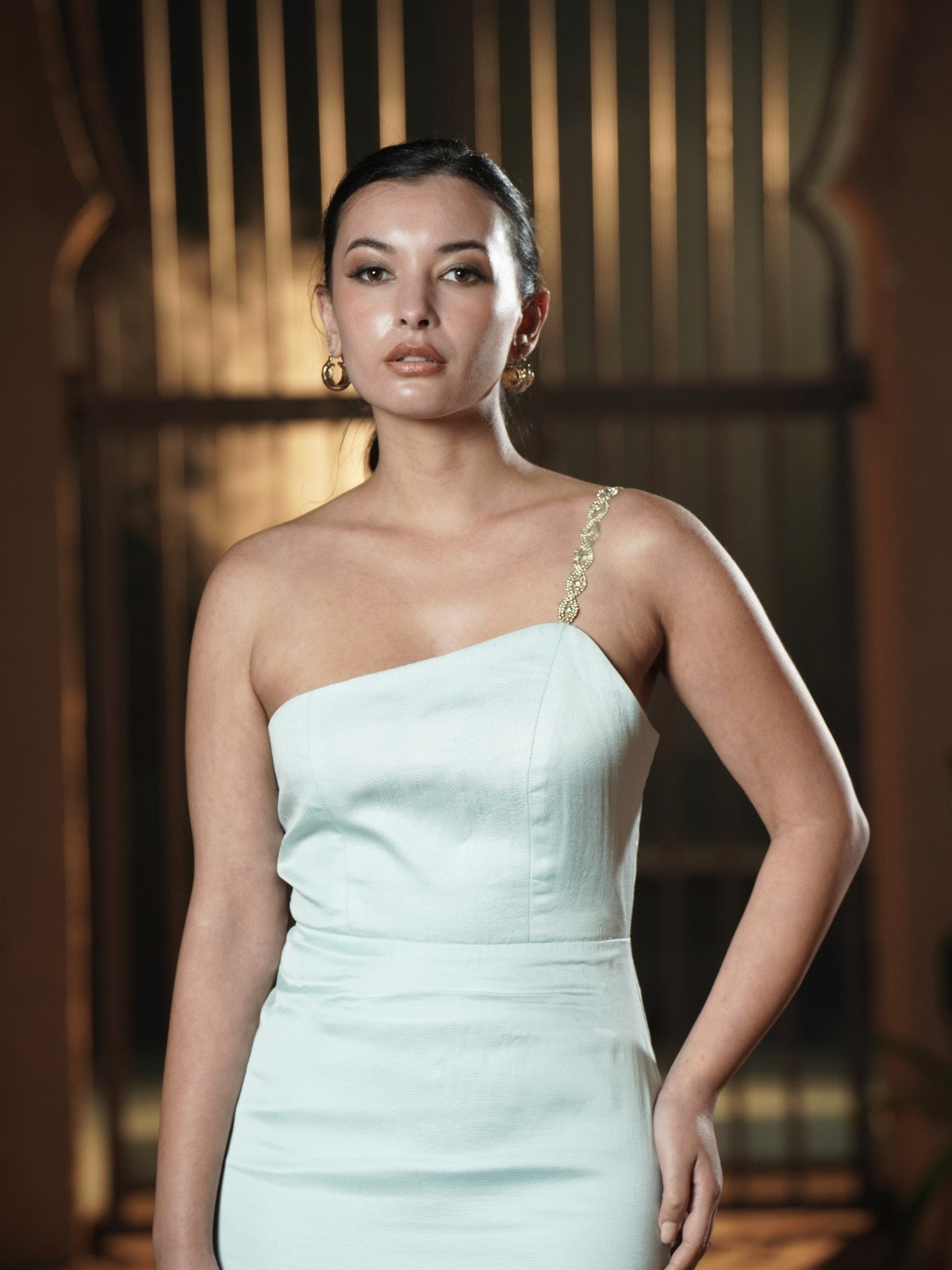 A study in quiet glamour, the Aera Gown brings together sculpted minimalism and soft luminosity. Cut in a clean one-shoulder silhouette, it features a delicately jeweled strap that elevates the gown without overpowering it. The bodice is thoughtfully structured to contour the frame, flowing into a refined straight-cut skirt with a back slit for effortless movement.
