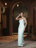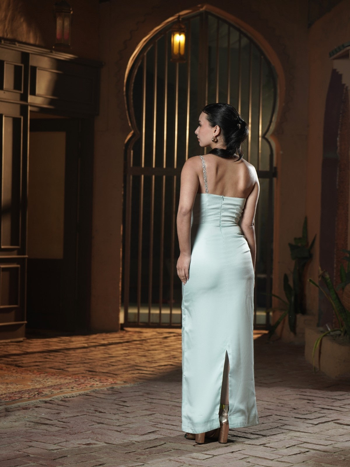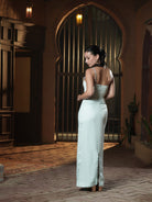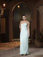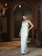 Finished in a serene pastel tone with a gentle sheen, this gown embodies understated luxury — elegant, modern, and designed for the woman who lets her presence speak before her clothes.