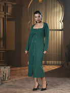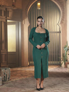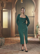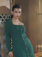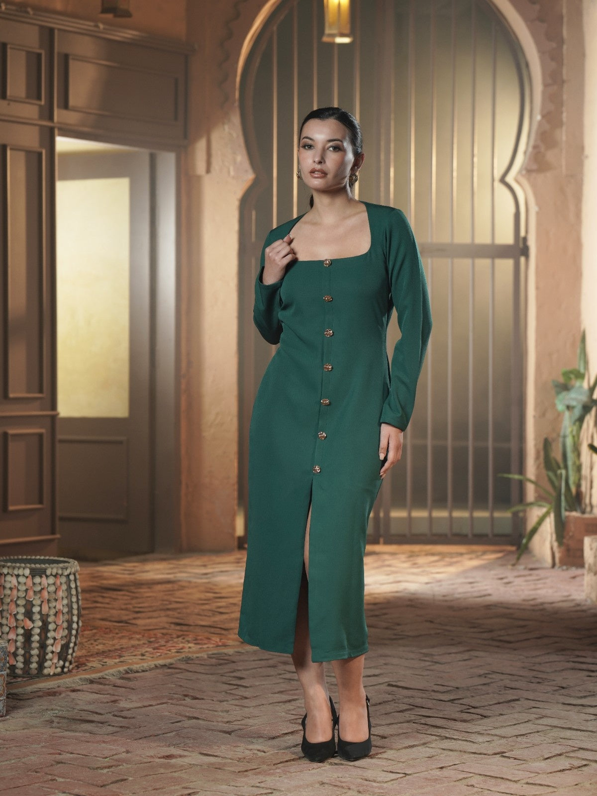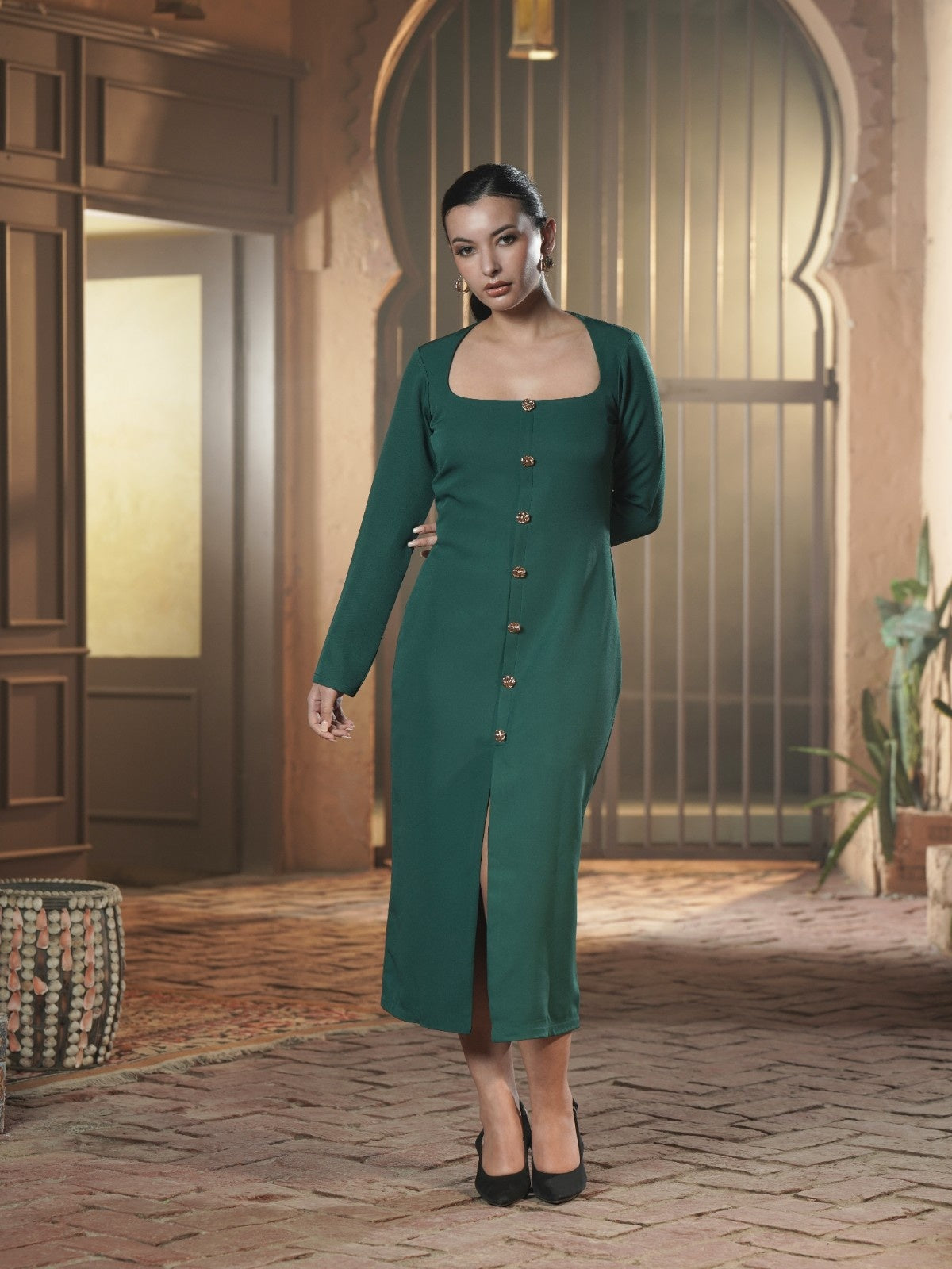 A quietly striking silhouette crafted in our signature soft-structured finish. The dress features a sculpted square neckline, fluid long sleeves and a single linear row of molten gold buttons — creating a perfectly balanced, elongated frame.