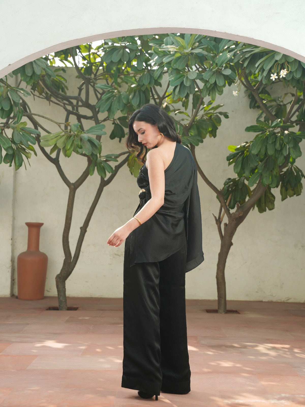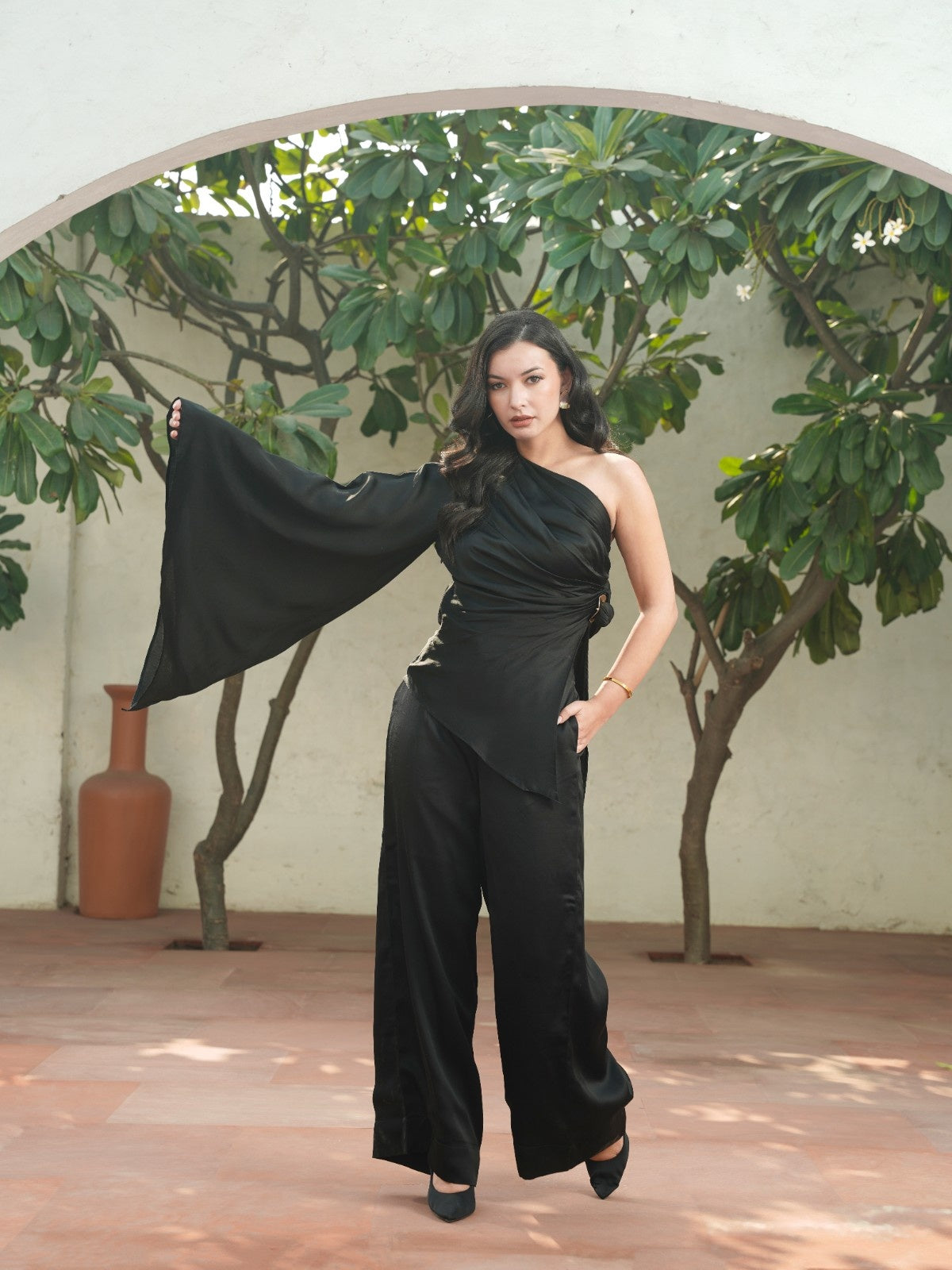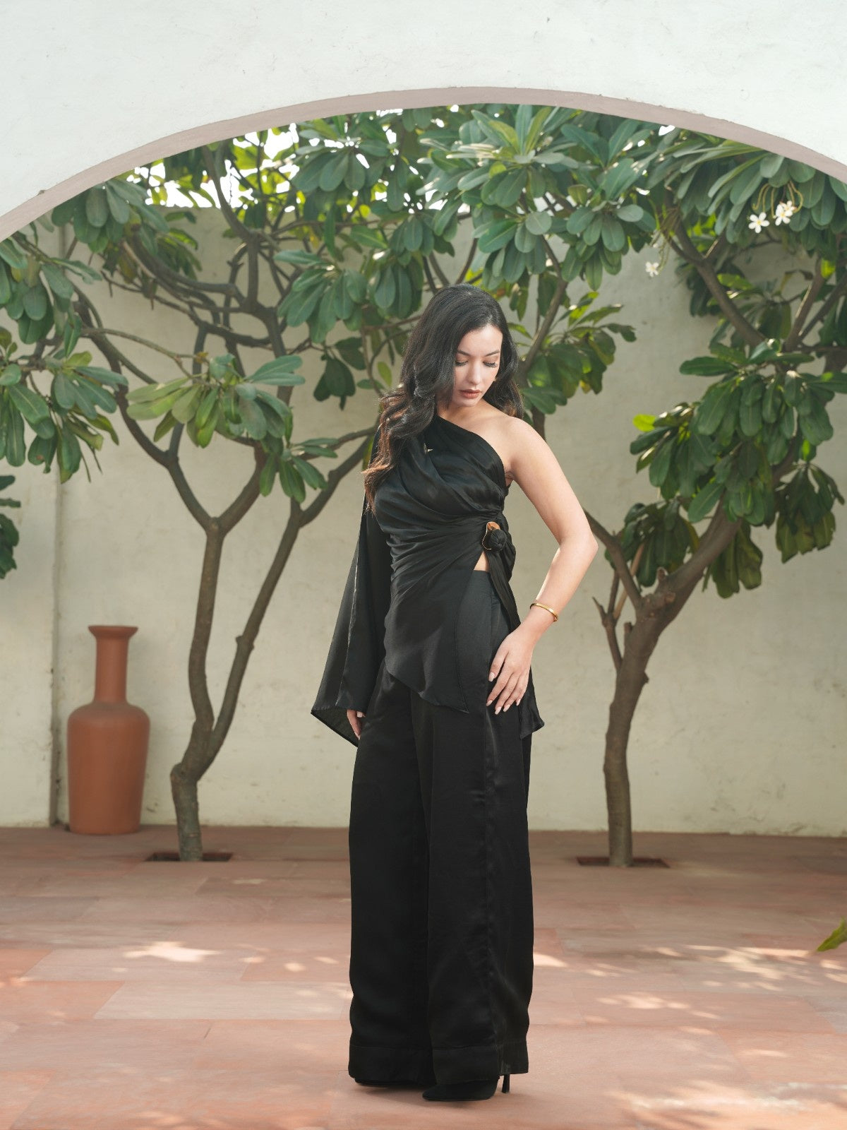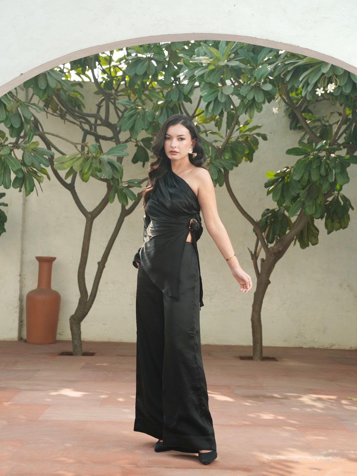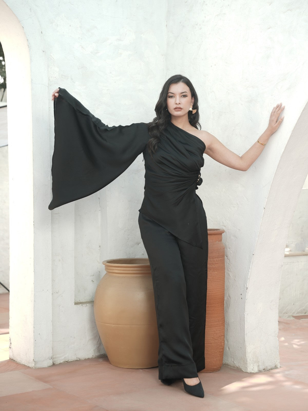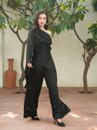 Cut to command attention, the La Lueur black edit set is crafted in viscose linen that drapes with liquid ease. The asymmetrical one-shoulder top features a sculpted fall, a dramatic cascading sleeve, and a gold-accented side knot that adds subtle structure. Paired with wide-leg trousers in the same fluid fabric, it’s an elevated statement for evenings that call for refined drama and effortless confidence.