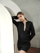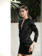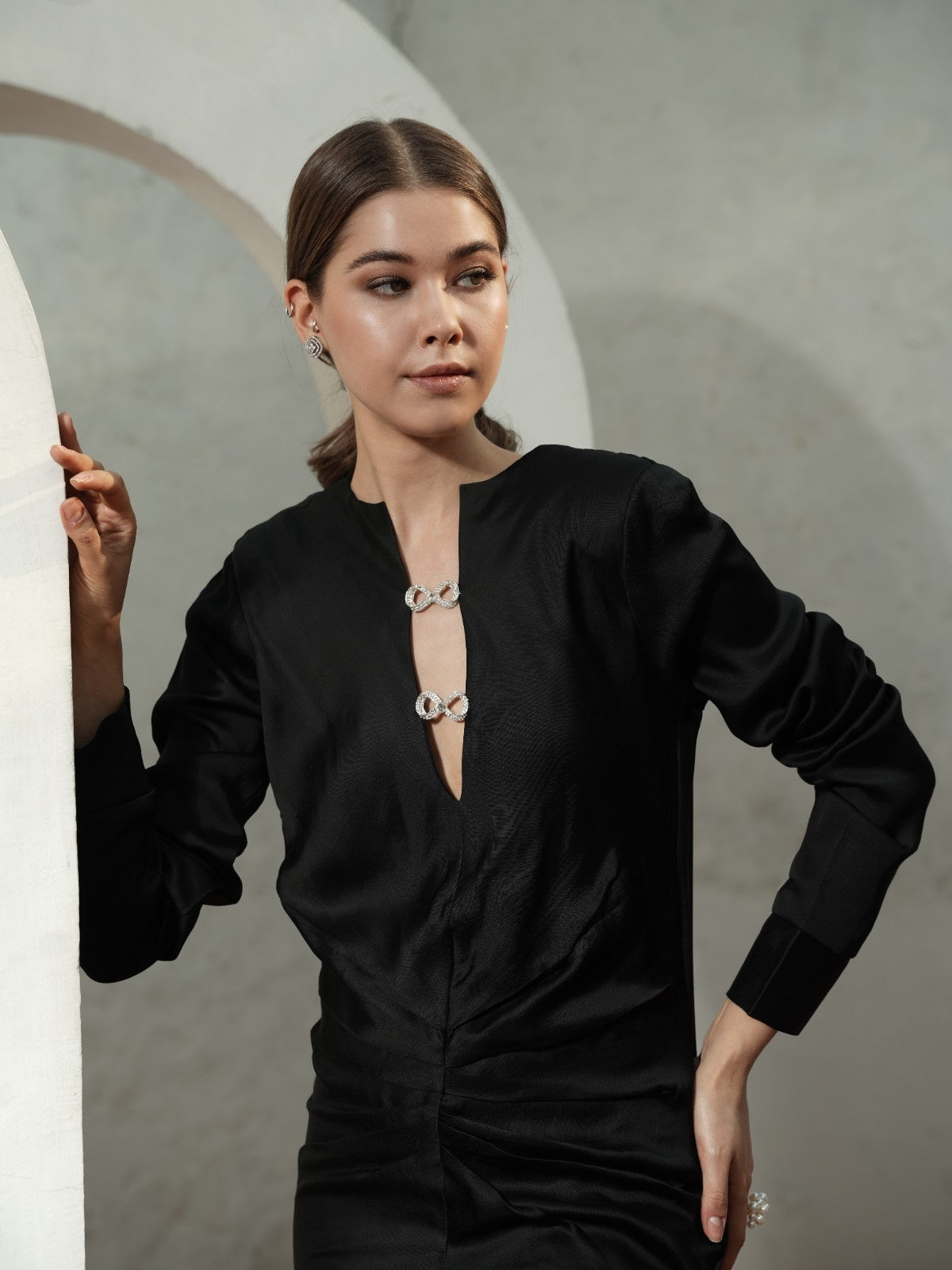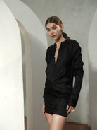 A polished mini that blends quiet luxury with a hint of sparkle. The signature linked detail draws the eye effortlessly, while the soft front gathering shapes the waist without trying too hard. Clean lines, long sleeves, and a sleek silhouette come together in a piece that feels refined, modern, and irresistibly chic — day or night.
