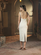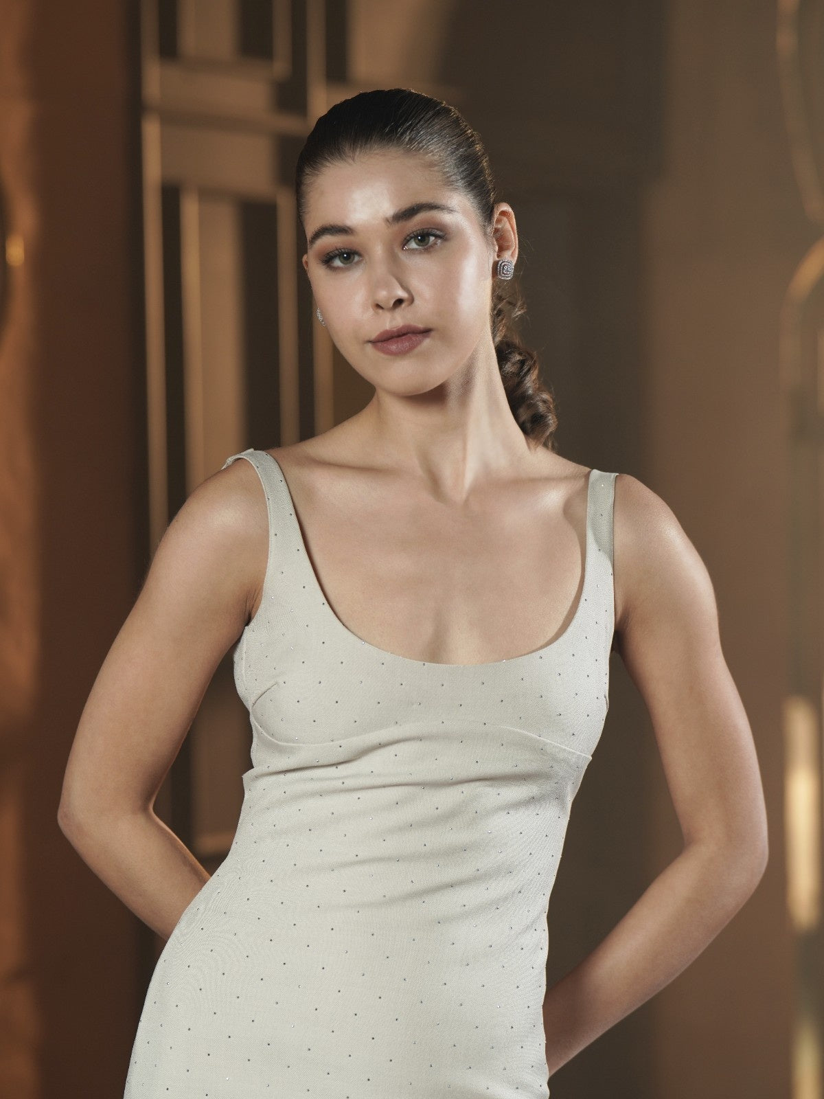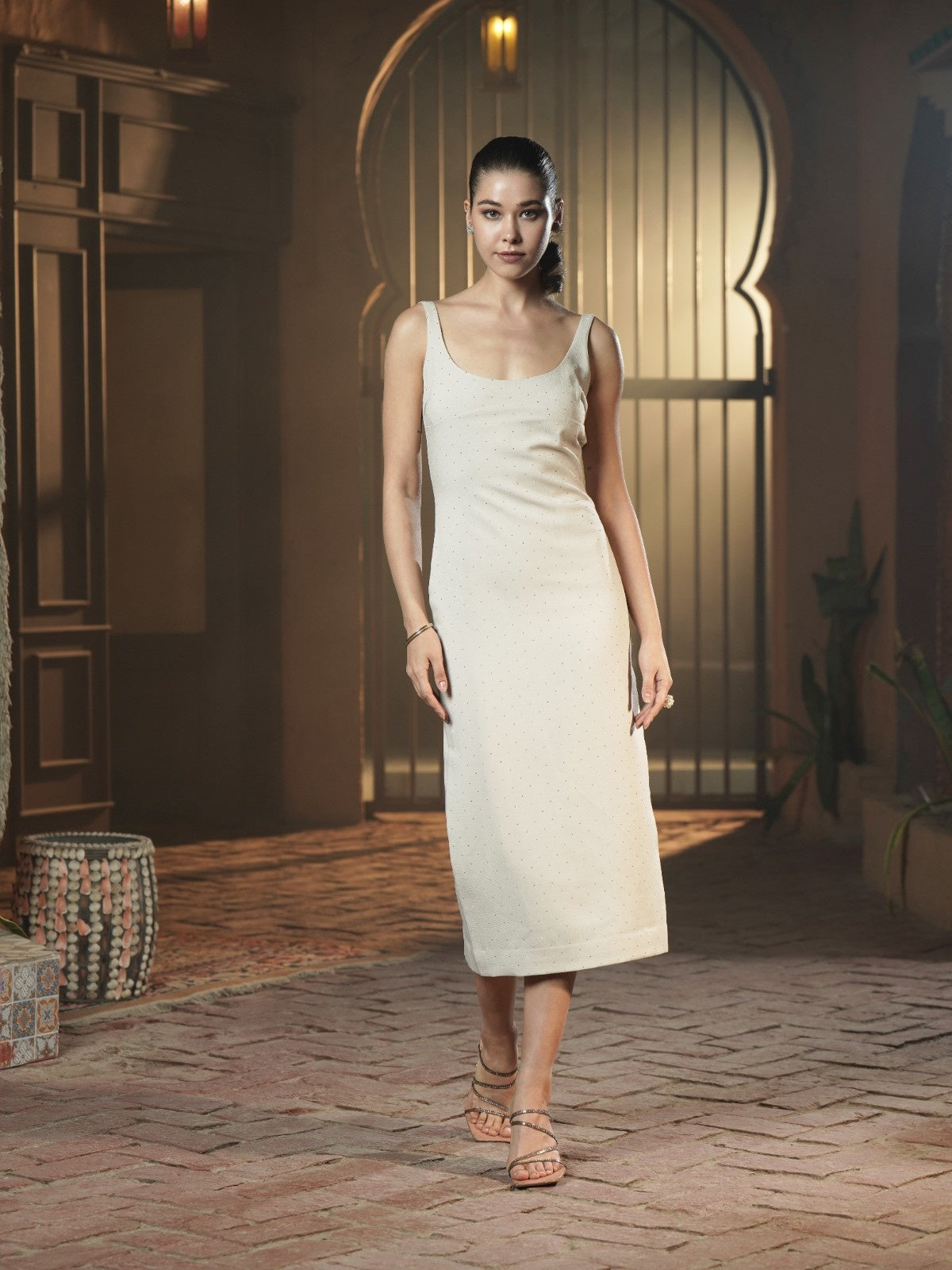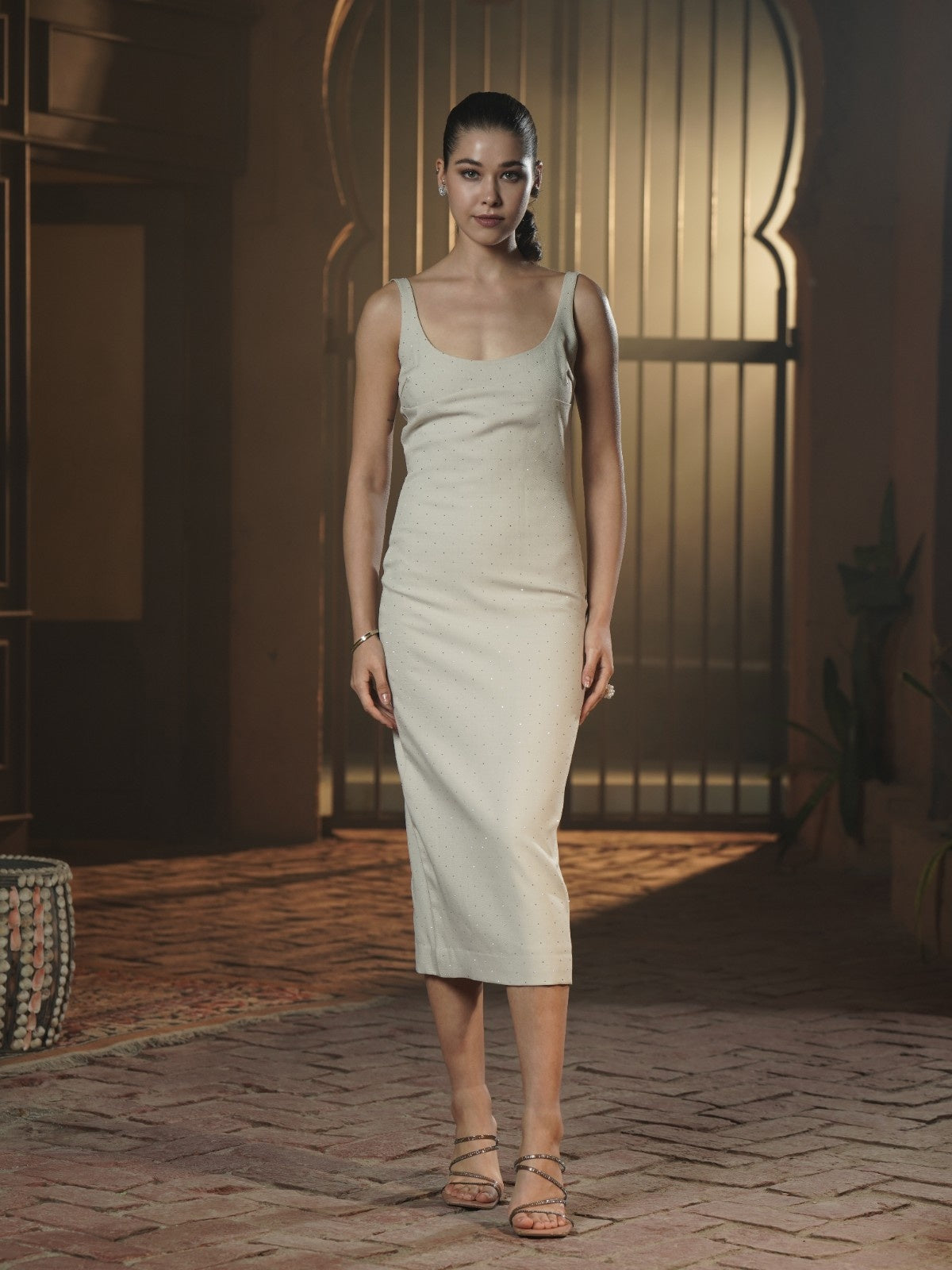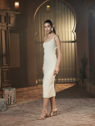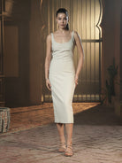 Cut in a sculpted midi silhouette with a gently scooped neckline and a deep, graceful back, this dress is dusted with delicate tonal crystals that shimmer softly without shouting. Designed to glide along the body, it keeps the look minimal, refined and impossibly feminine.