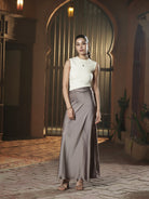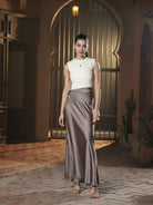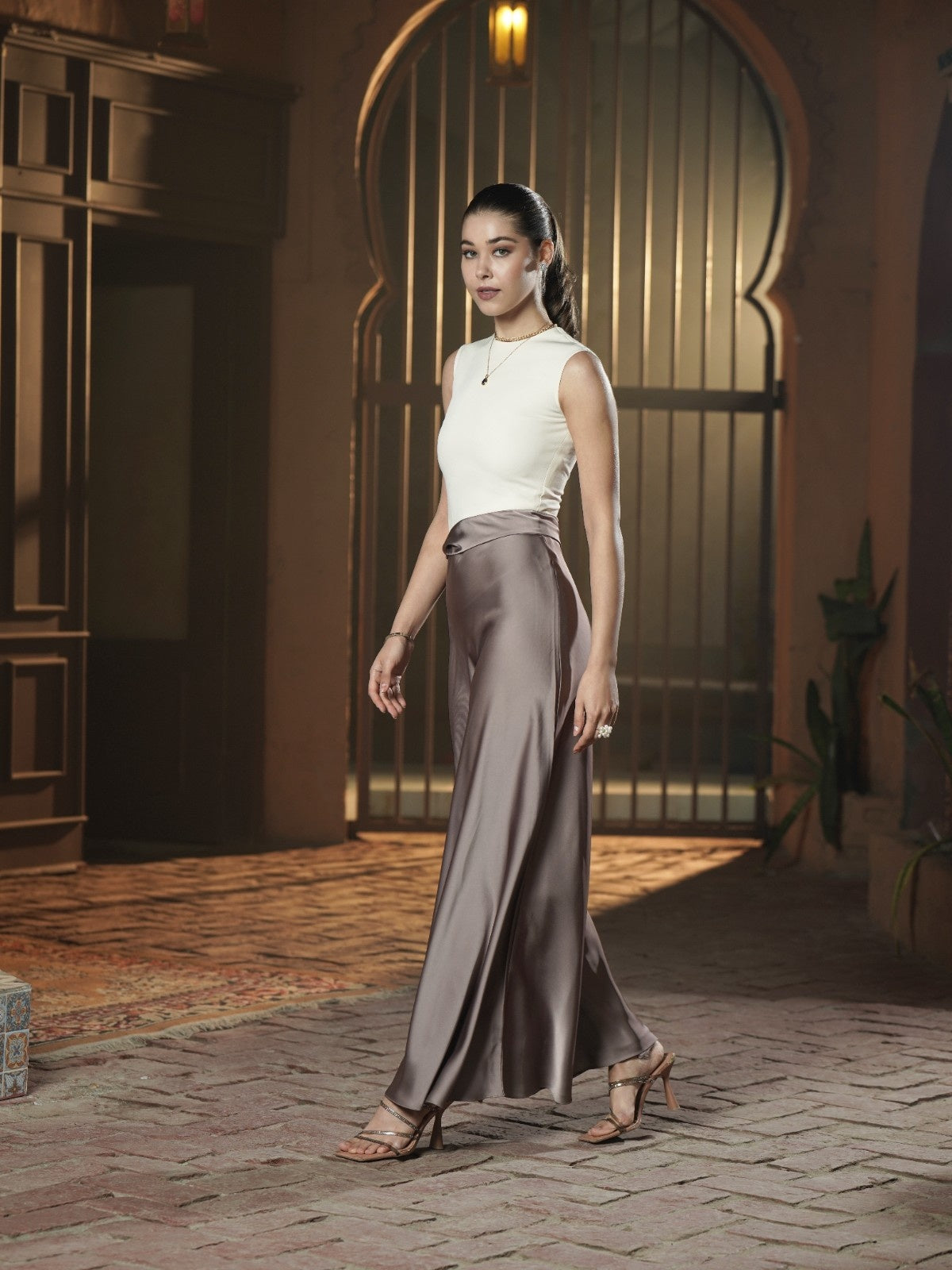 A fluid satin maxi dress designed to glide with every step. The silhouette features a sculpted wrapped waist that cinches softly, flowing into a long, liquid-like skirt that elongates the frame. Minimal at the top, statement in its movement — it’s the kind of quiet-luxury piece that feels effortless yet undeniably refined.