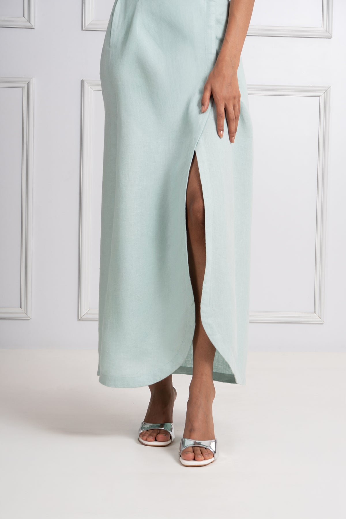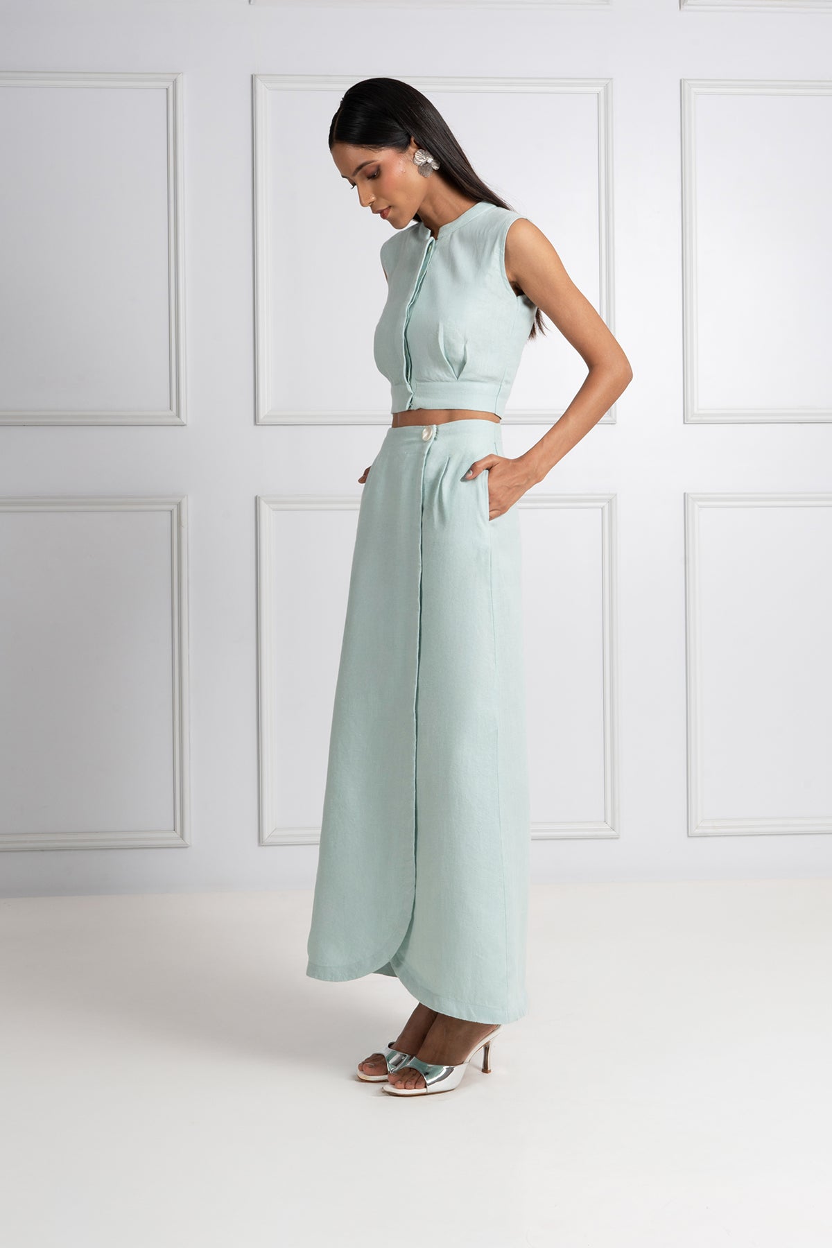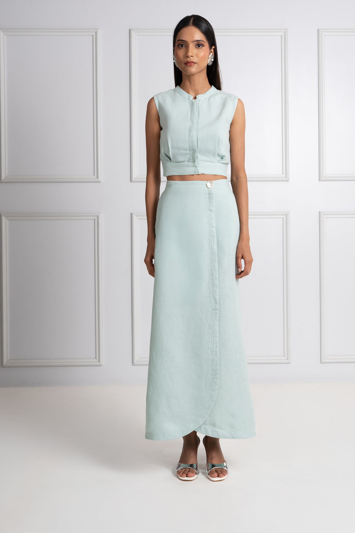 The Azura Skirt is crafted from soft, herringbone-textured linen in a muted blue tone for effortless sophistication. Its wrap-style silhouette, clean lines, and hidden pockets create a refined yet relaxed look. Falling to a flattering midi length, it’s a summer essential that moves seamlessly from a resort escape to a city stroll. Pair it with the matching structured crop top or your favourite warm-weather staples for versatile elegance.