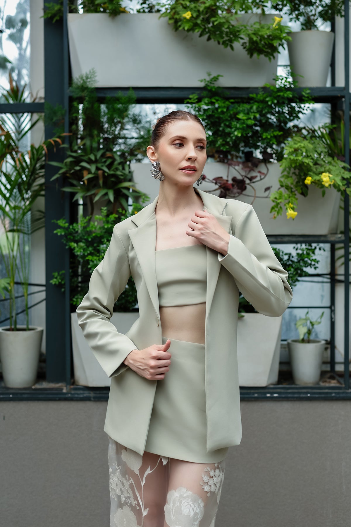 The Illume Top: A harmony of structure and softness. The Illume features a sculpted sage top with a bandeau-inspired design. Its delicate textures contrast with clean tailoring, creating a balance of power and poetry.
