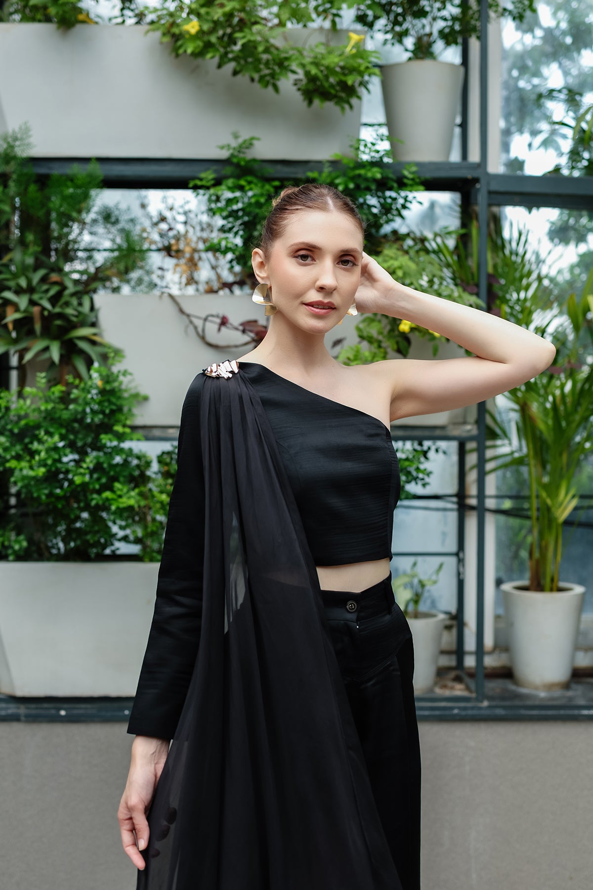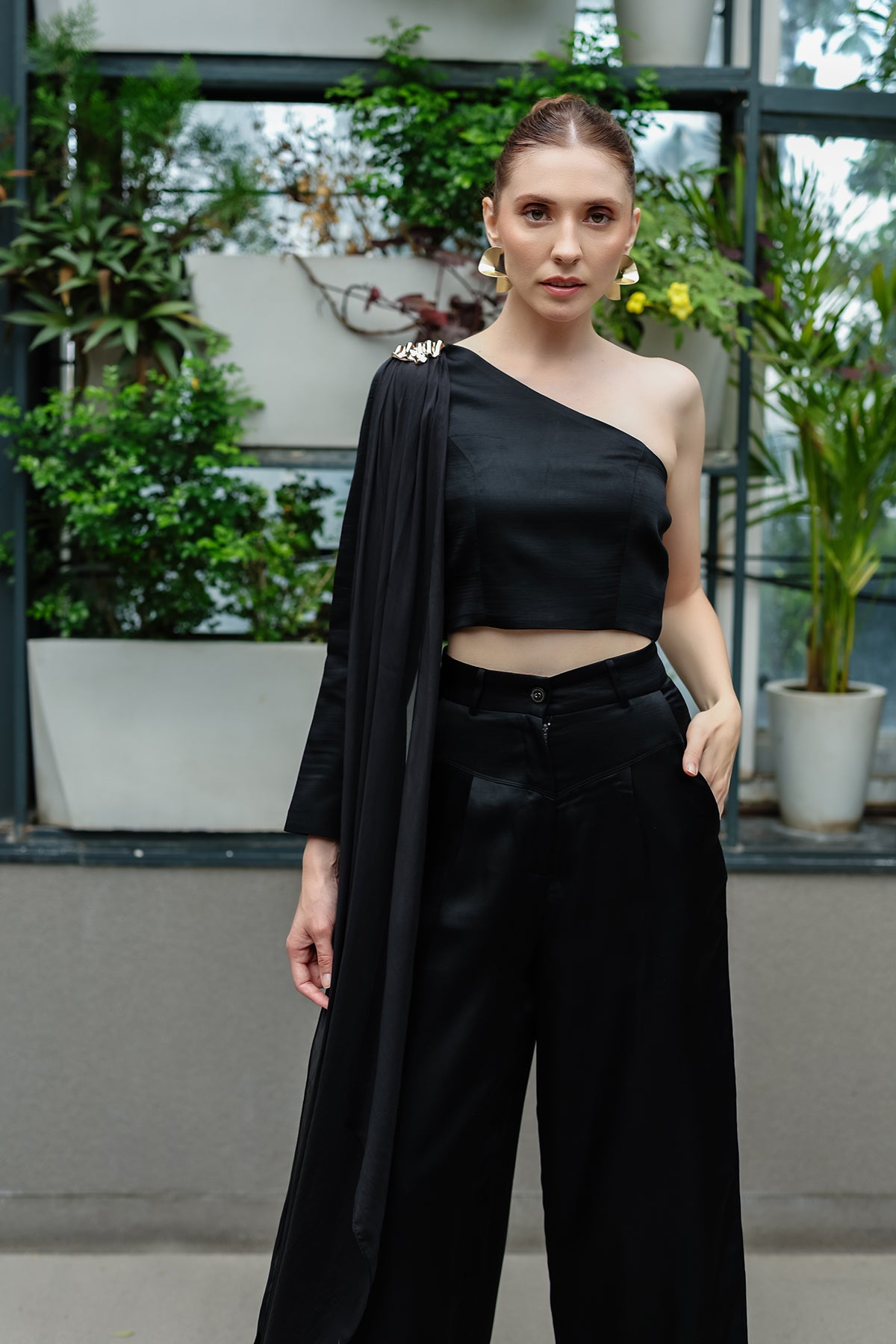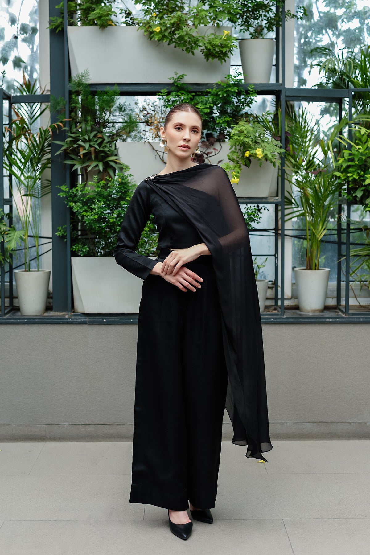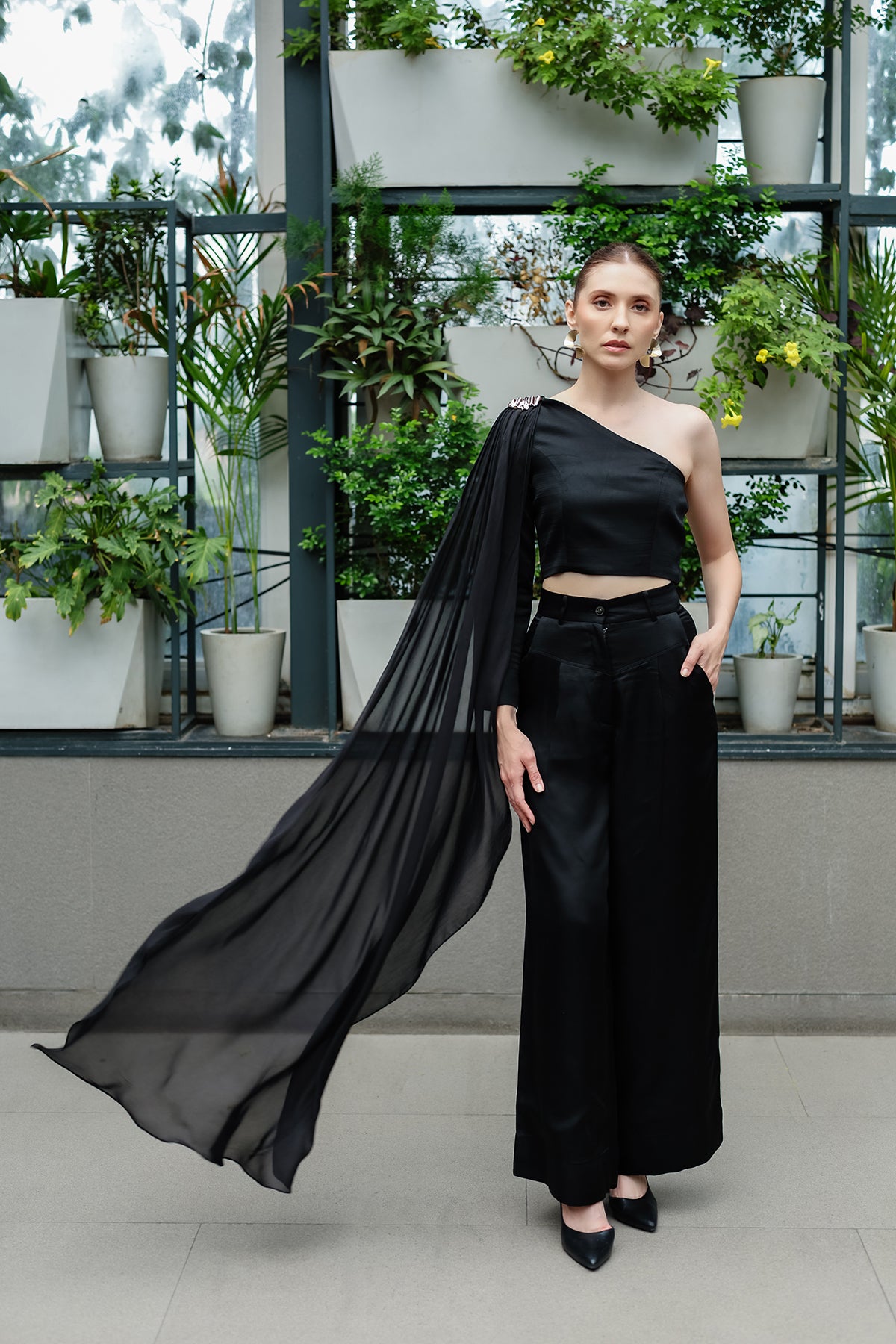 A study in contrast and fluidity, The Noir Drape is tailored in a sculpted asymmetric top, balanced by a cascading chiffon satin drape that flows like liquid midnight. The wide-leg silhouette grounds the look with power, while the sheer satin veil brings in movement, sensuality, and an undeniable touch of drama.