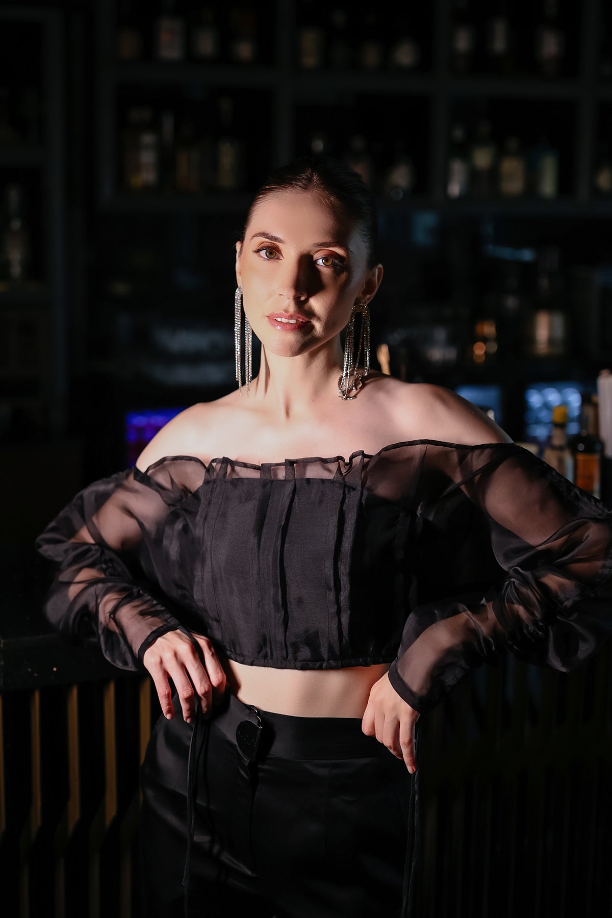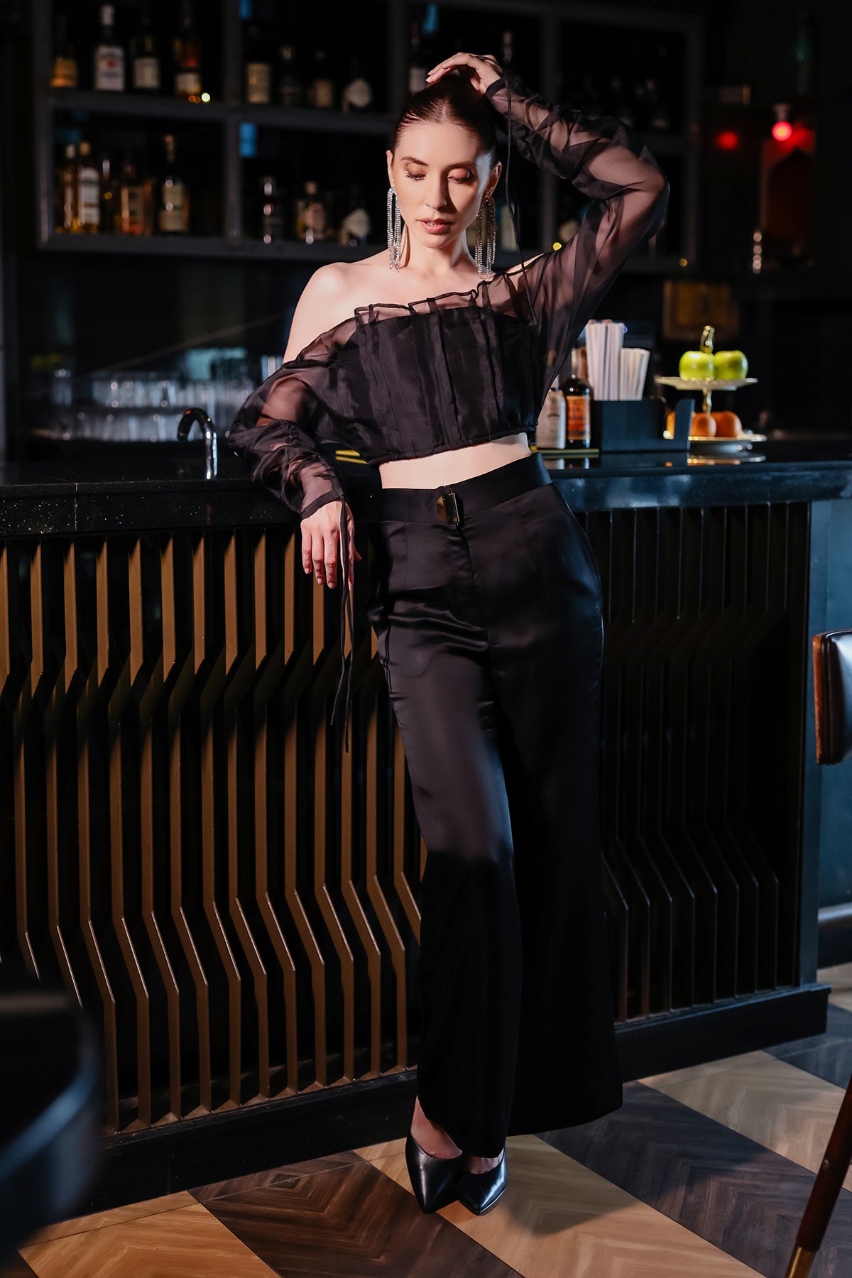 A bold interplay of transparency and structure, The Obsidian Muse pairs a sheer organza off-shoulder top—delicately ruched and finished with ribbon ties. Designed for evenings that demand confidence, allure, and a touch of mystique, this look is a modern ode to power dressing with a romantic edge.