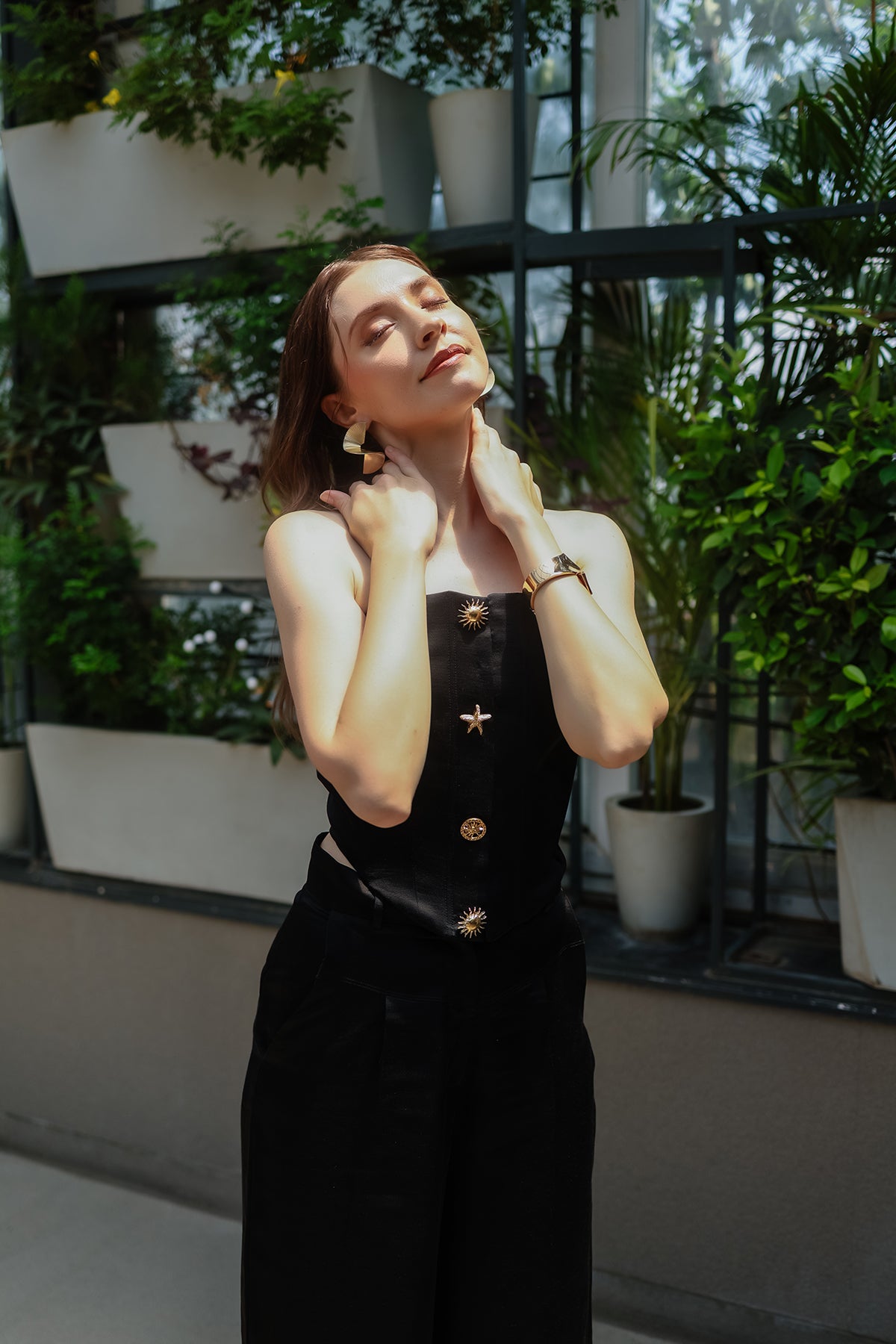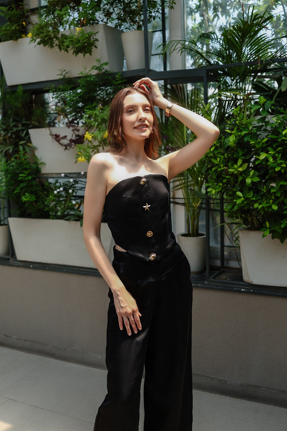 A sharp black corset with a polished fall and subtle sheen. Detailed with bold statement buttons, this set redefines minimalism with a touch of drama. Designed for the modern woman, it reflects confidence, structure, and effortless elegance—a piece that stands strong without excess.