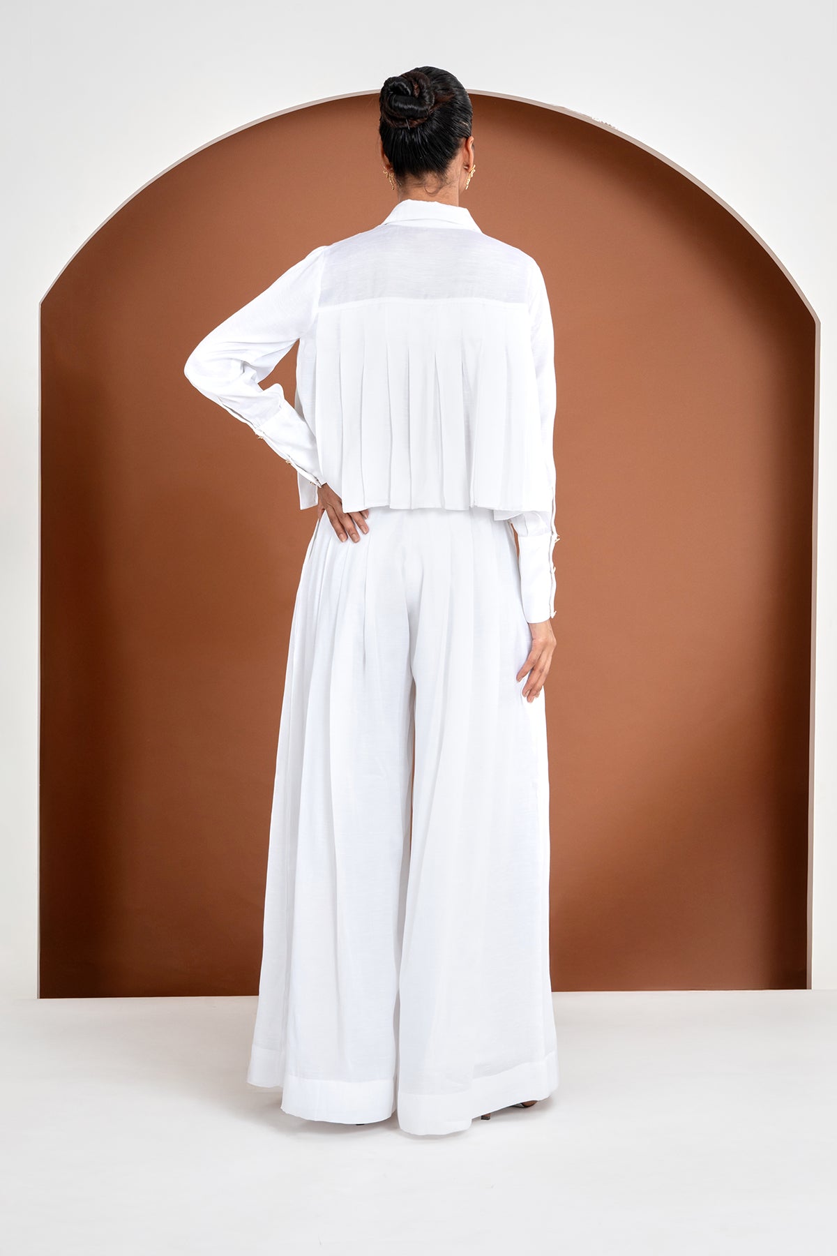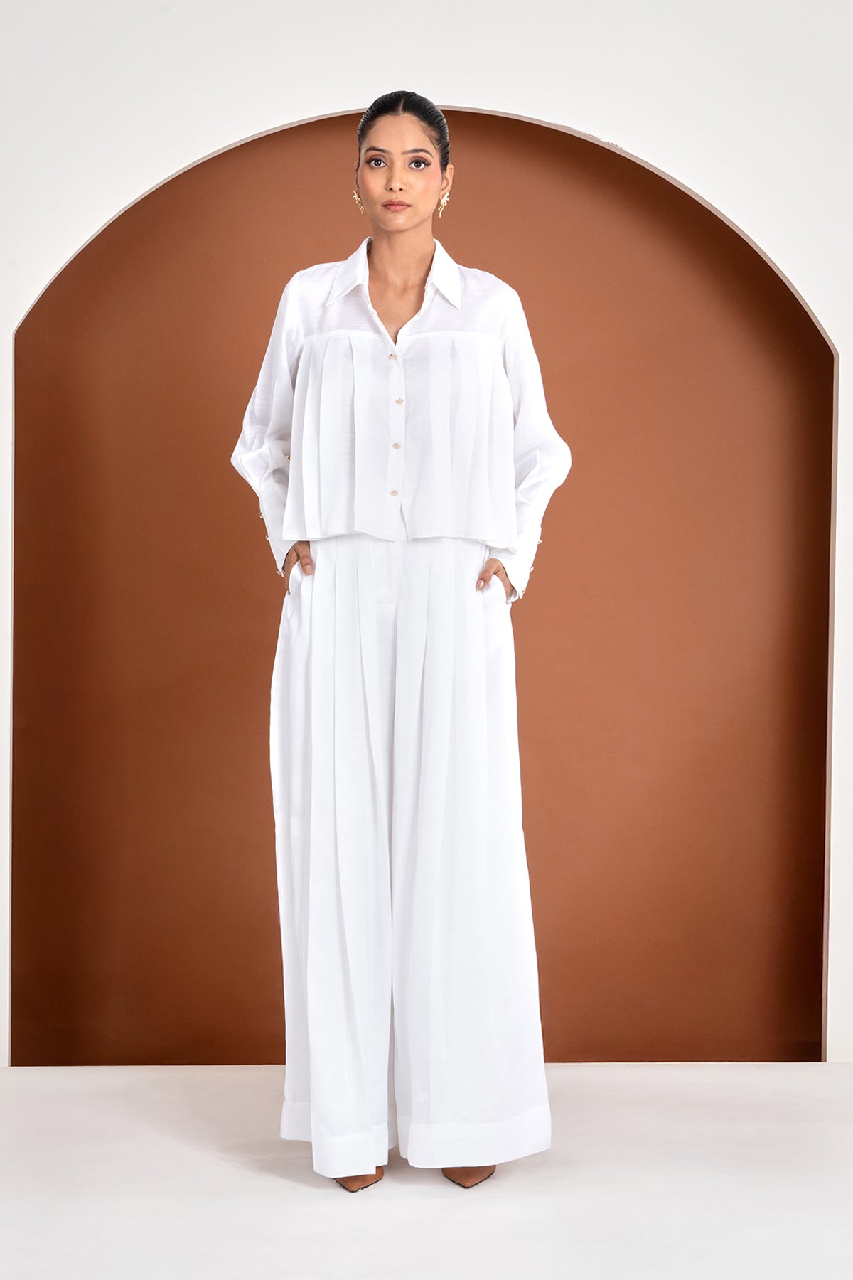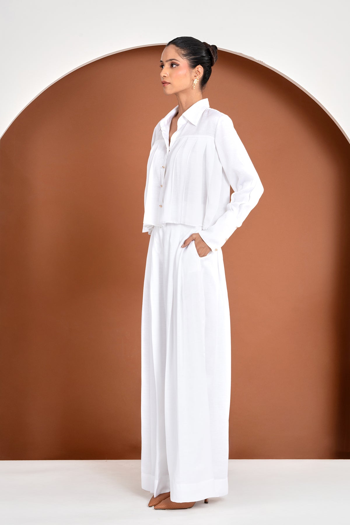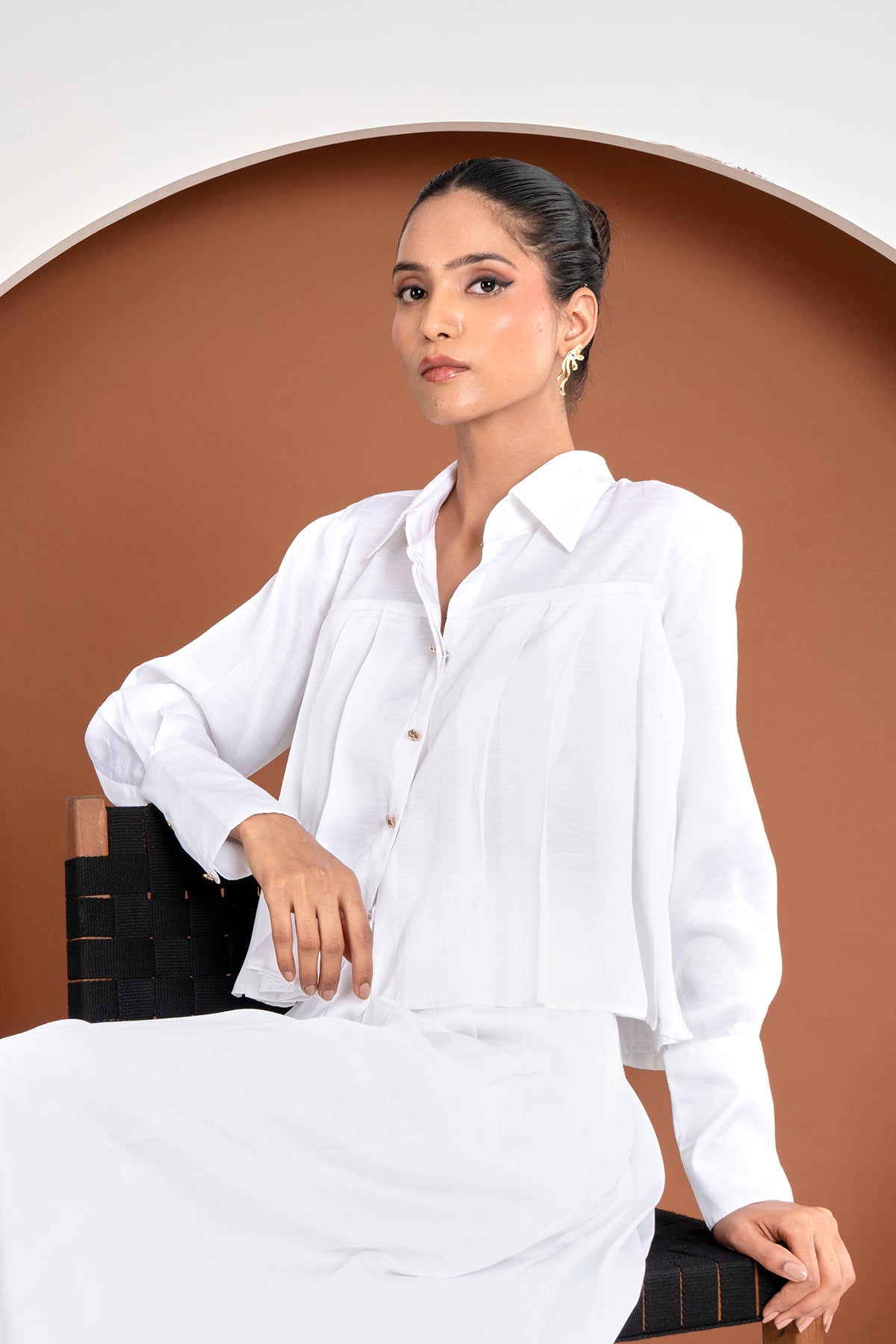 A vision in ivory. The Opaline Top is tailored in soft, fluid fabric with sharp pleating that adds depth to its structured silhouette. The cropped design features a concealed button placket and sculptural pleats, creating a minimalist statement piece for gallery days, rooftop evenings, or any moment you want to feel timeless yet modern.