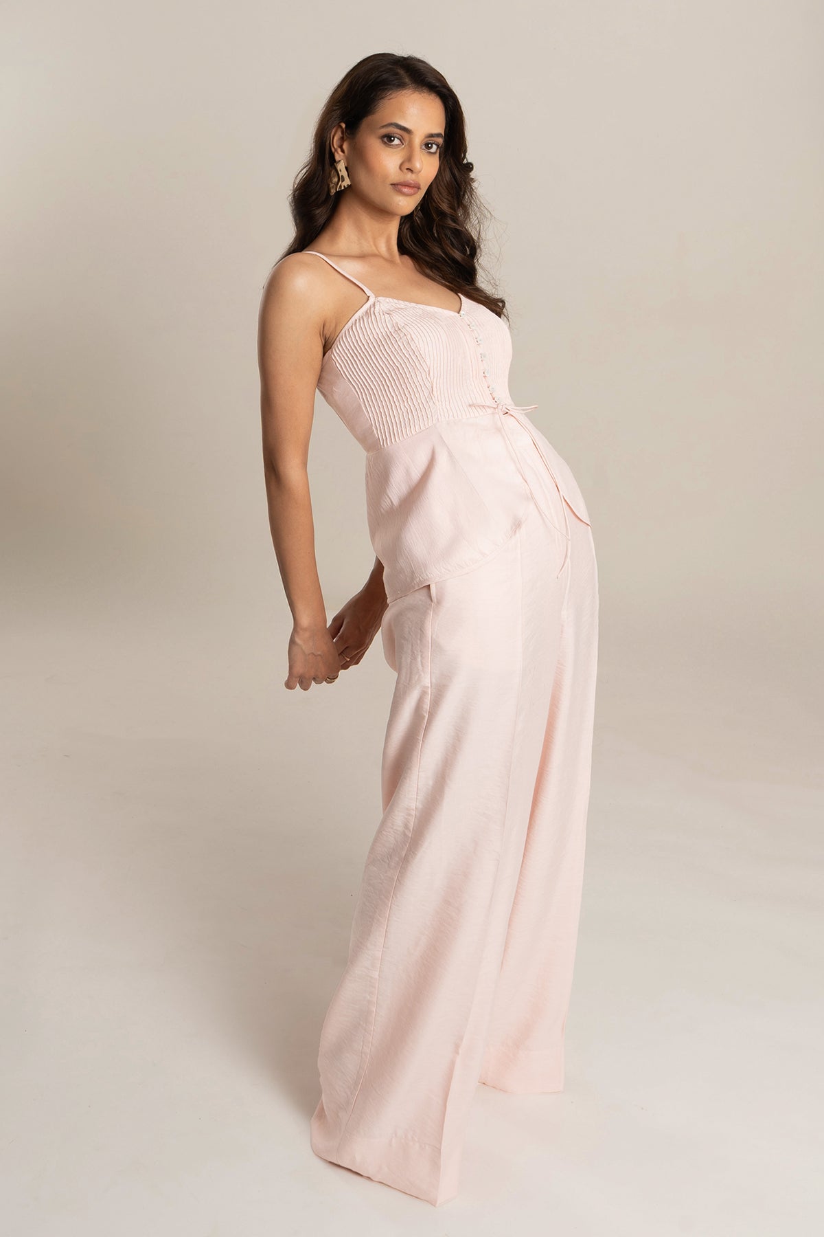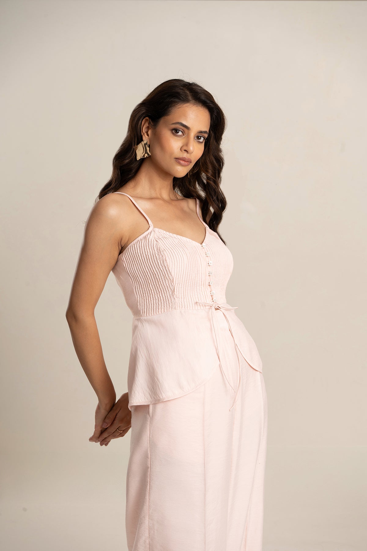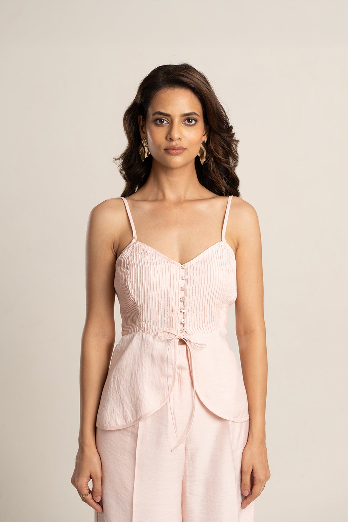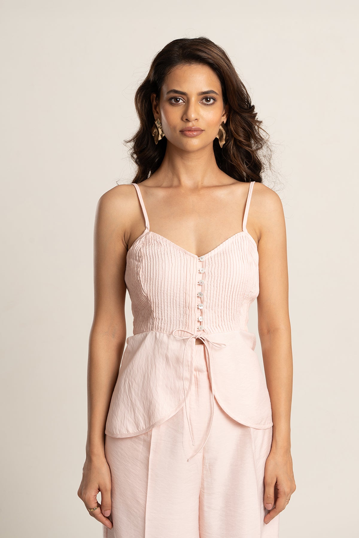 Soft power redefined. The Rosette Top is a corset-inspired design with delicate buttons and a tie detail, sculpting the waist with gentle precision. In a soft blush tone, it blends femininity with freedom — perfect for slow mornings, sunlit strolls, or elegant getaways.