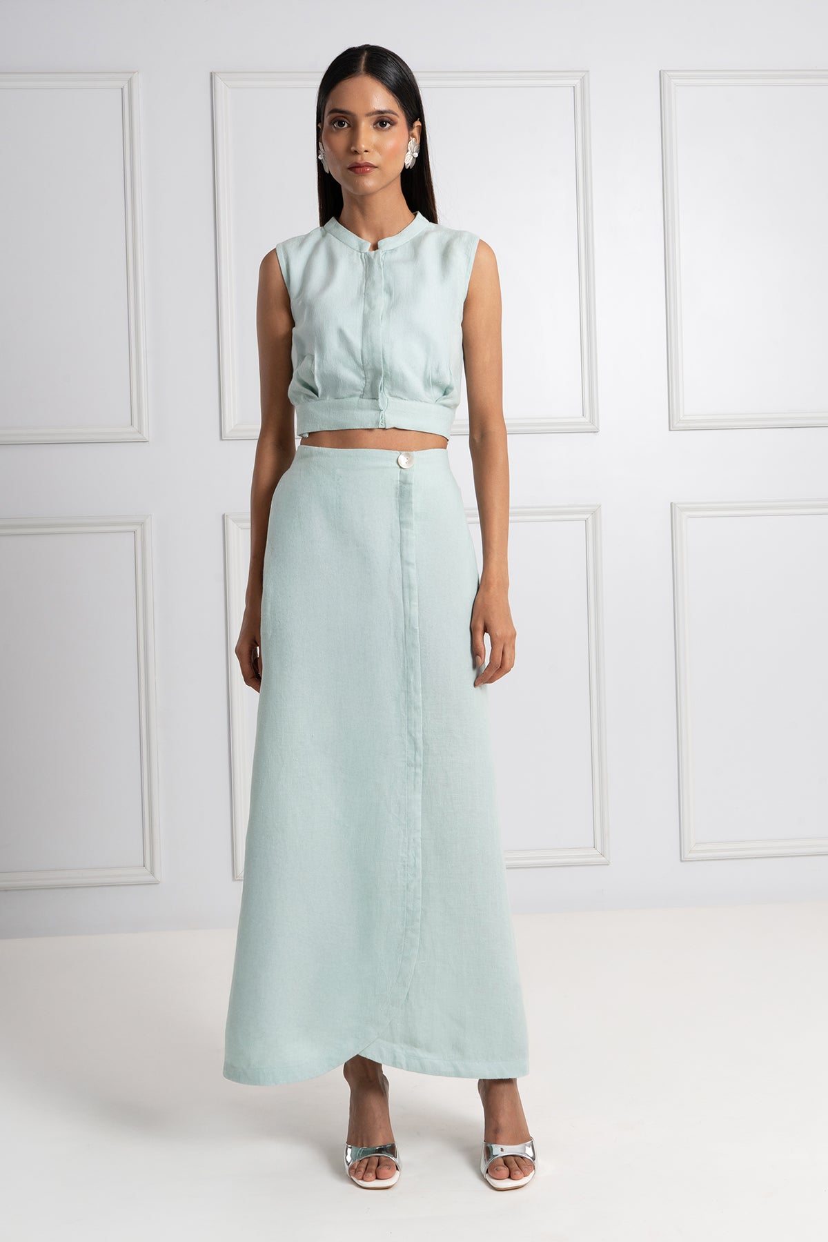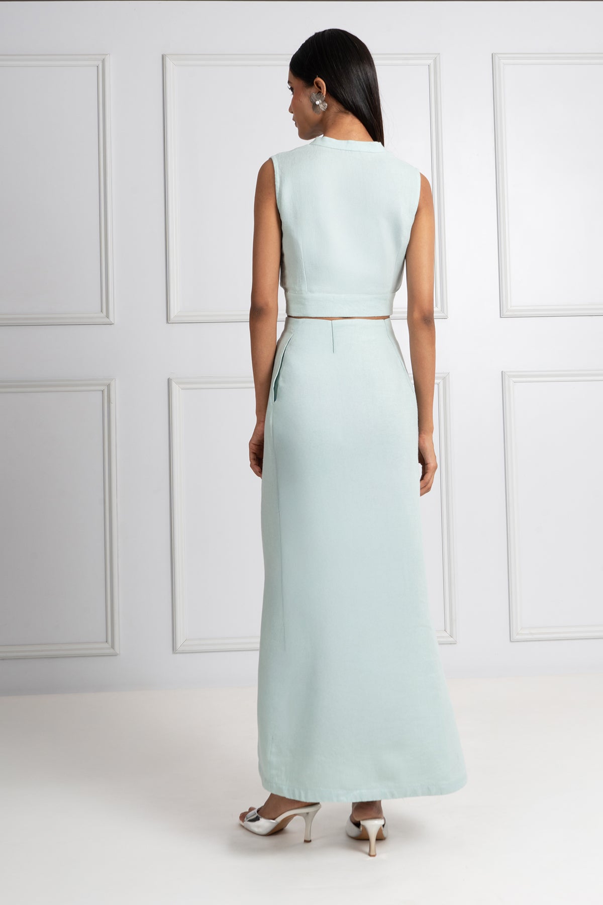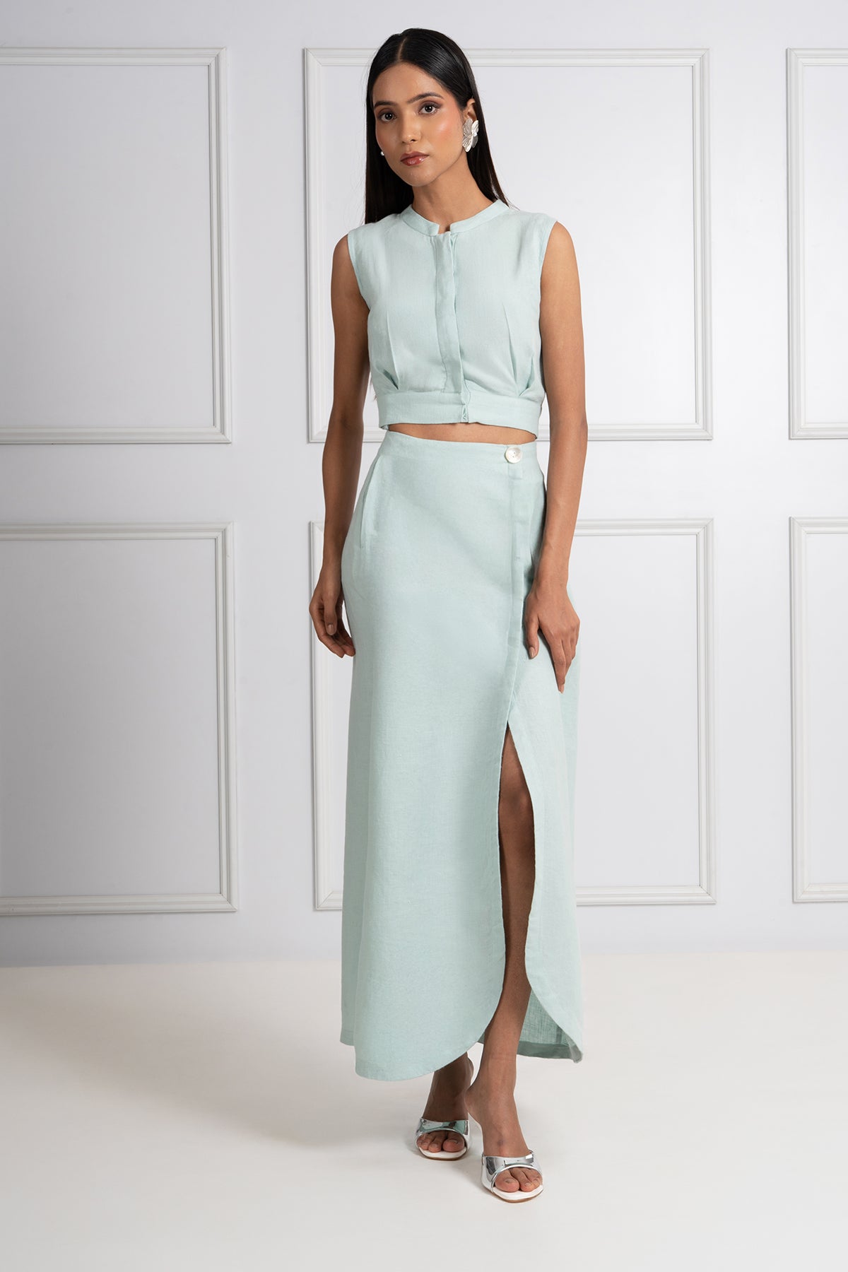 Minimalism with texture. The Azura Top is crafted in soft herringbone-textured linen in a muted blue tone, designed for effortless sophistication. The structured cap-sleeve crop silhouette offers clean lines and refined detailing — a summer essential that transitions from resort escape to city stroll with ease.