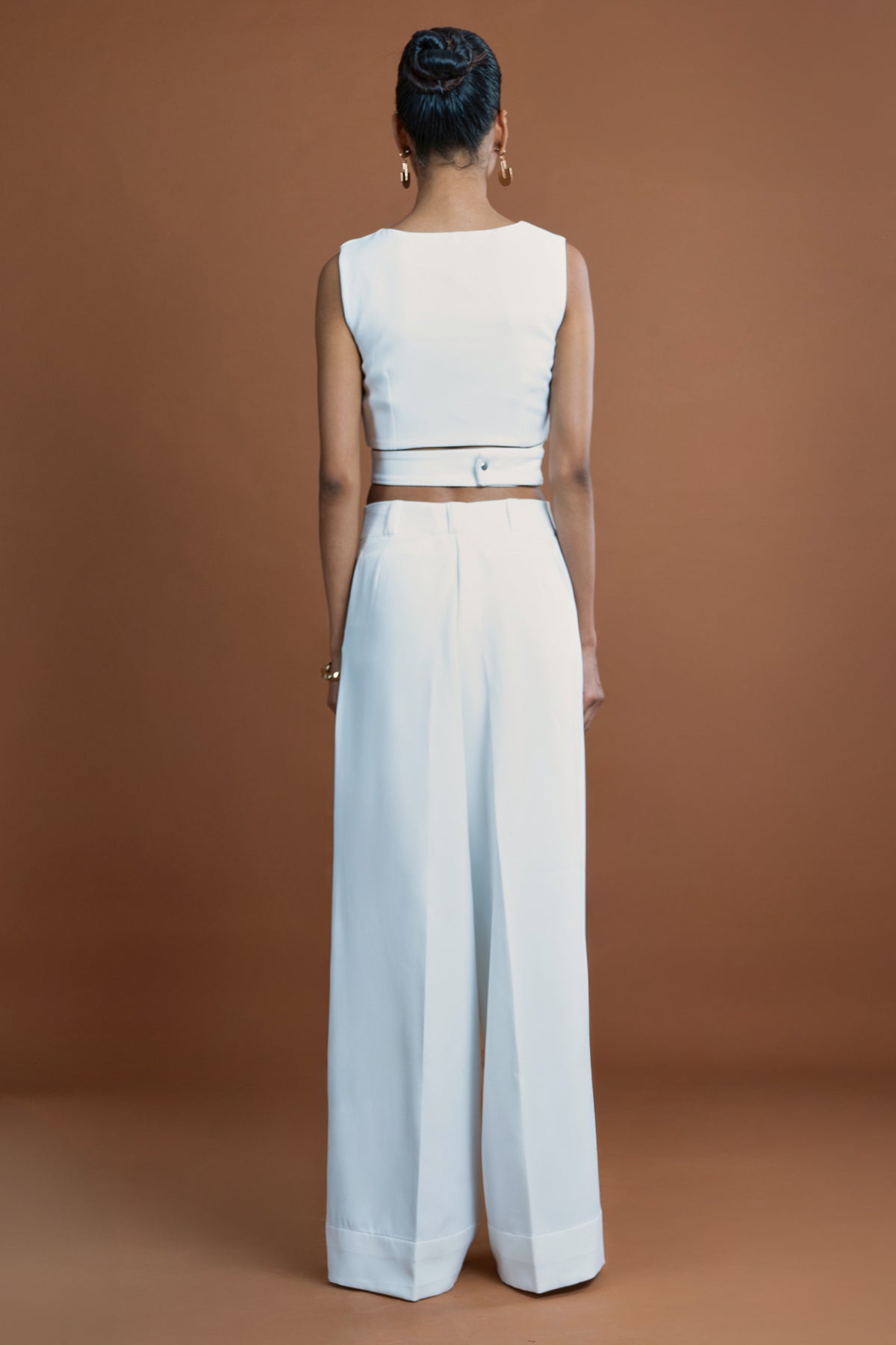 Clean lines, sharp tailoring, and subtle allure — the Axis Trousers are crafted in banana crepe for a sleek yet fluid finish. The high-waisted, wide-leg silhouette elongates the frame, offering a modern take on effortless power dressing. Available in classic black and timeless white.