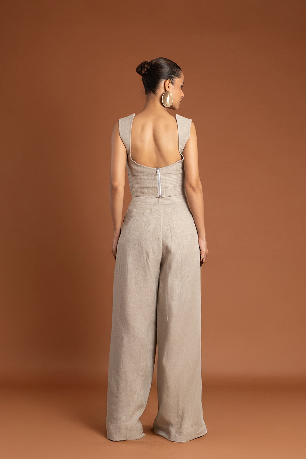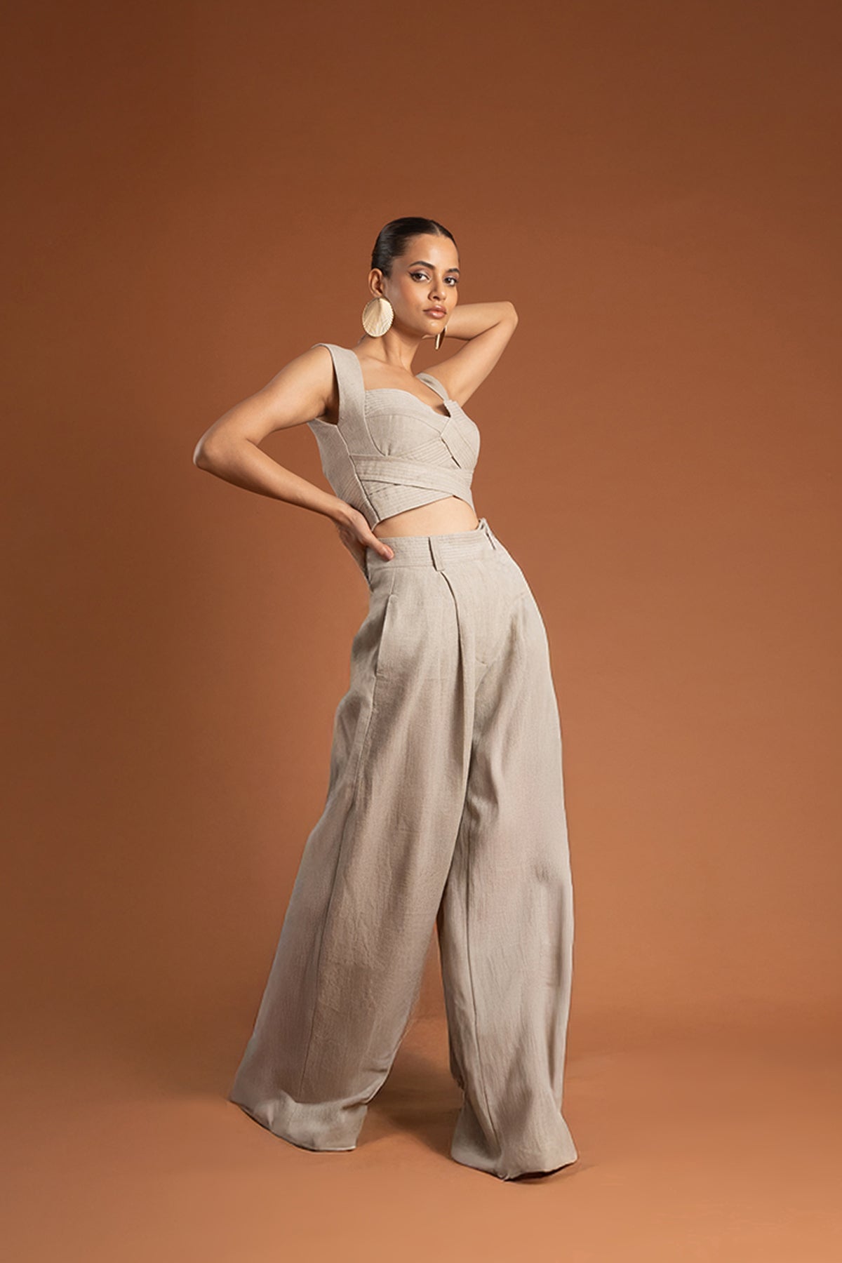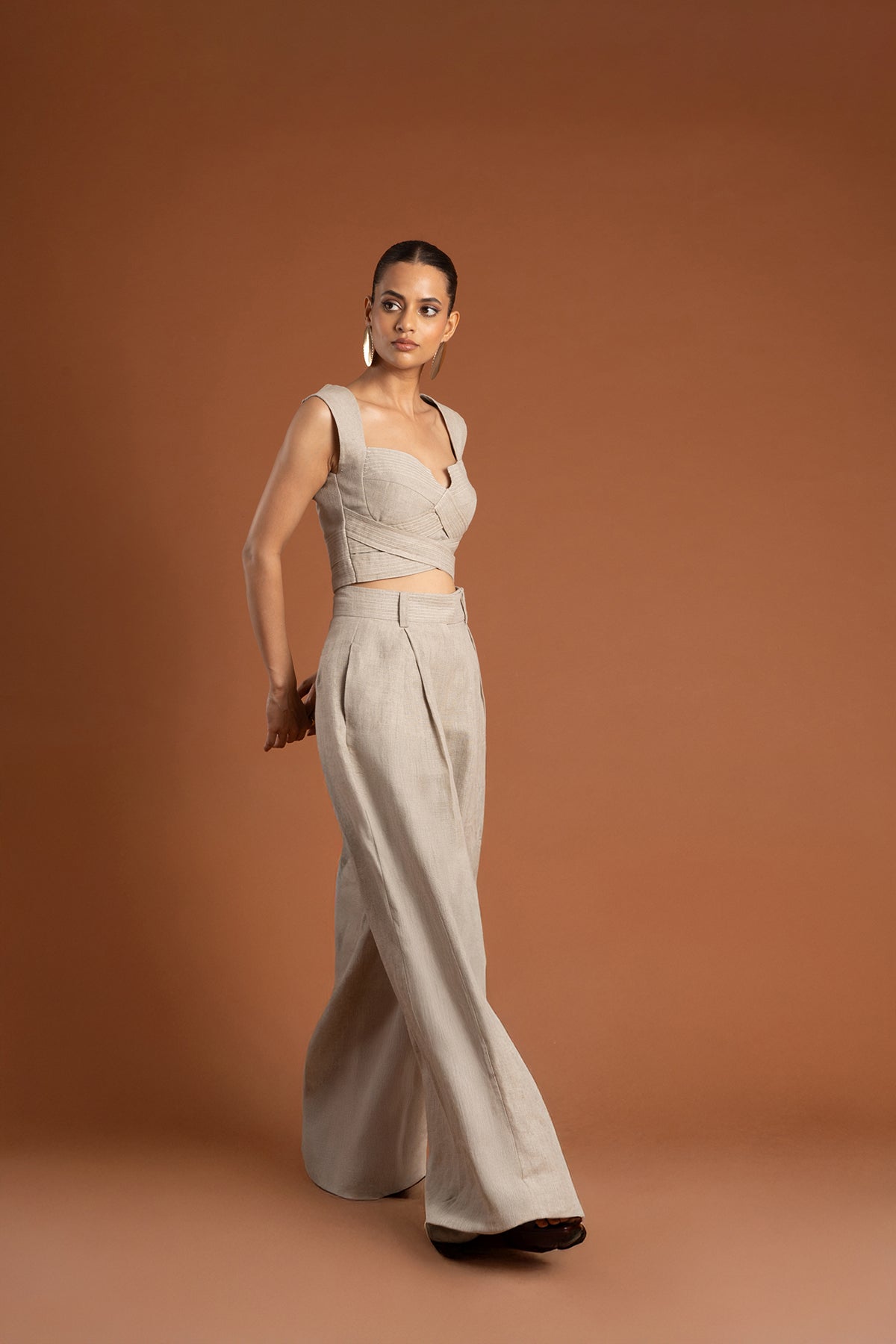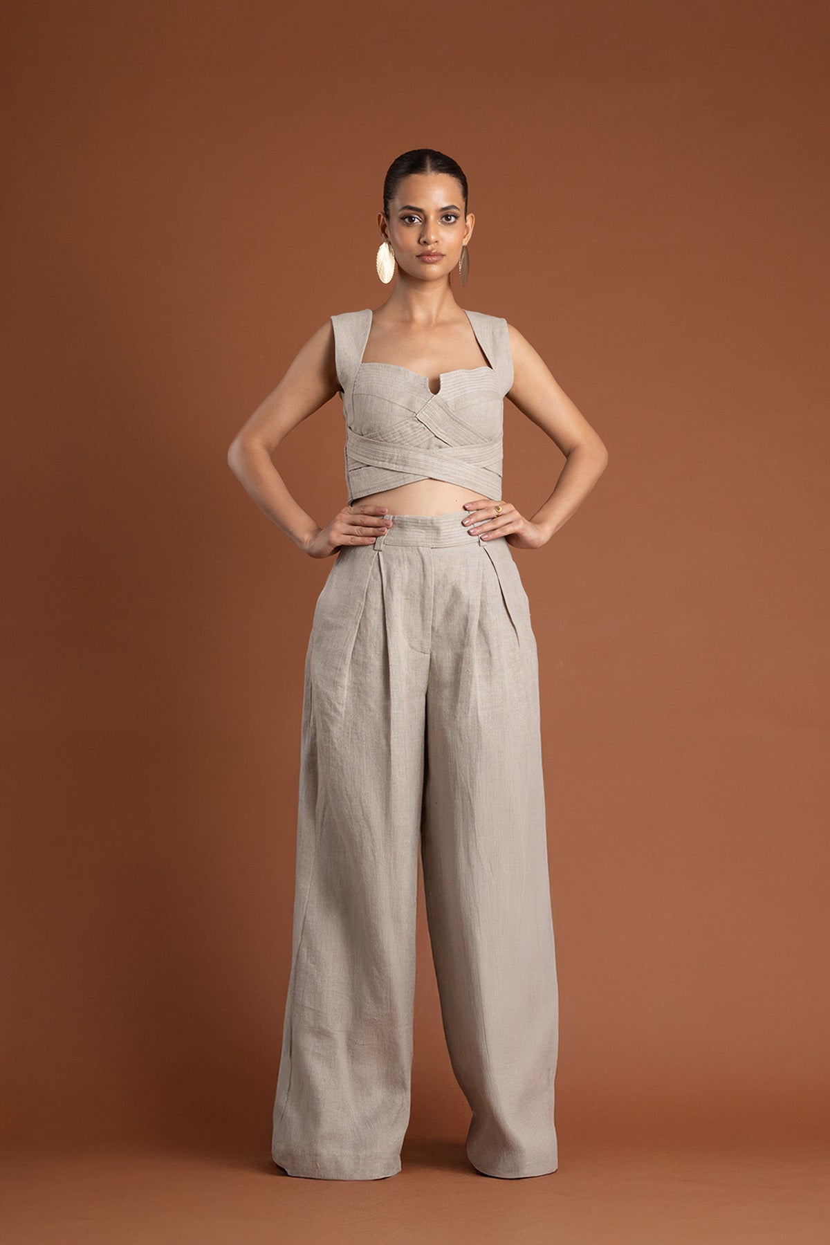 Effortlessly structured and endlessly flattering — the Sable Trousers are crafted in premium linen for elevated everyday dressing. Designed with a high-waisted fit and soft pleats that create a fluid, elongated silhouette, they offer both comfort and sophistication. The relaxed yet tailored shape flows with grace, making them perfect for warm days when you want to look powerful, polished, and effortlessly undone. Pair them with the matching corset-style crop top or your favorite blouse for a look that moves seamlessly from day to night.