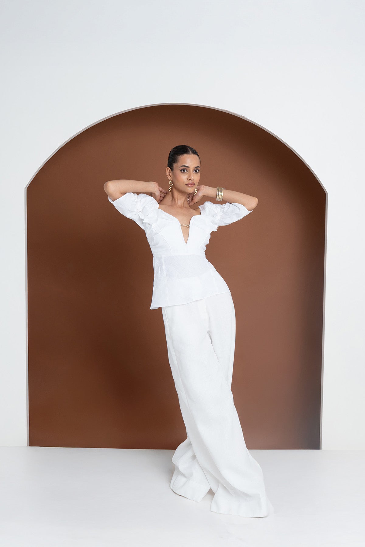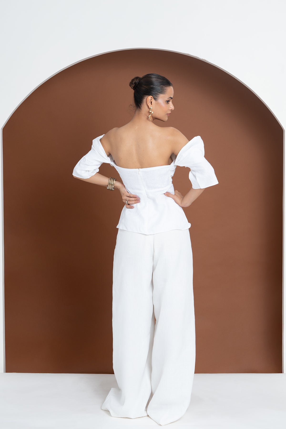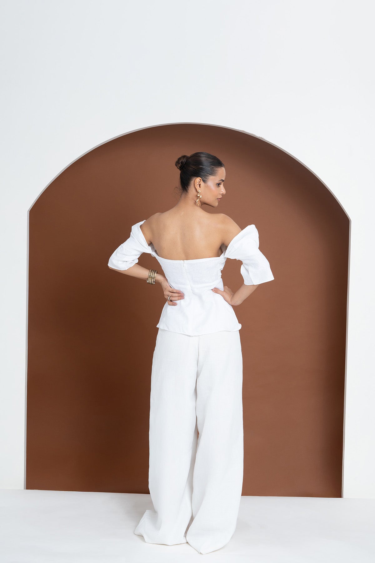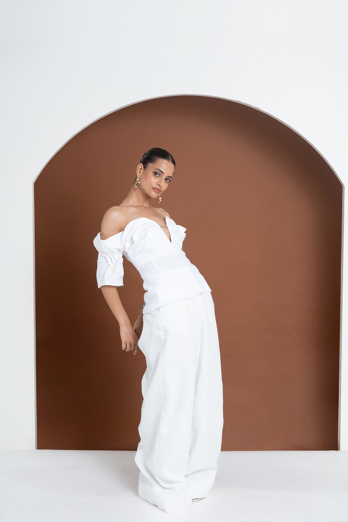 Where romance meets structure. The Luna Muse Set pairs relaxed wide-leg linen trousers with a sculpted off-shoulder corset top, balancing flow and form. Effortless by day, alluring by night — all in timeless white.