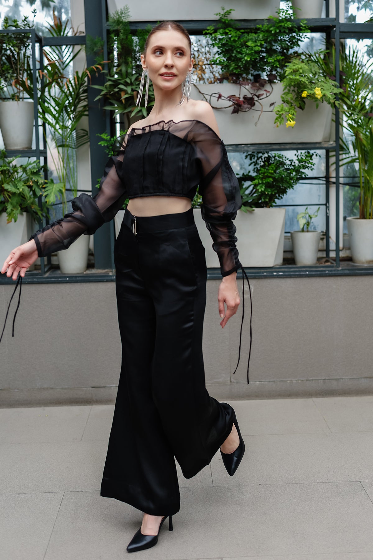 A bold interplay of transparency and structure, The Obsidian Muse tailored viscose satin linen trousers. The silhouette, balancing fluidity with sharp lines. Designed for evenings that demand confidence, allure, and a touch of mystique, this look is a modern ode to power dressing with a romantic edge.