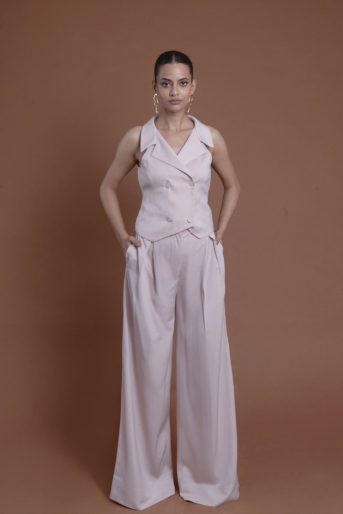Crisp pleated wide-leg trousers in breathable linen, cut to flow with ease while holding their sharp lines. Deep pockets add function without compromising the refined silhouette. Paired with a structured halter-style vest in a clean double-breasted front and a subtle waist curve, this co-ord balances summer ease with boardroom polish. For the woman who leads with softness and strength.