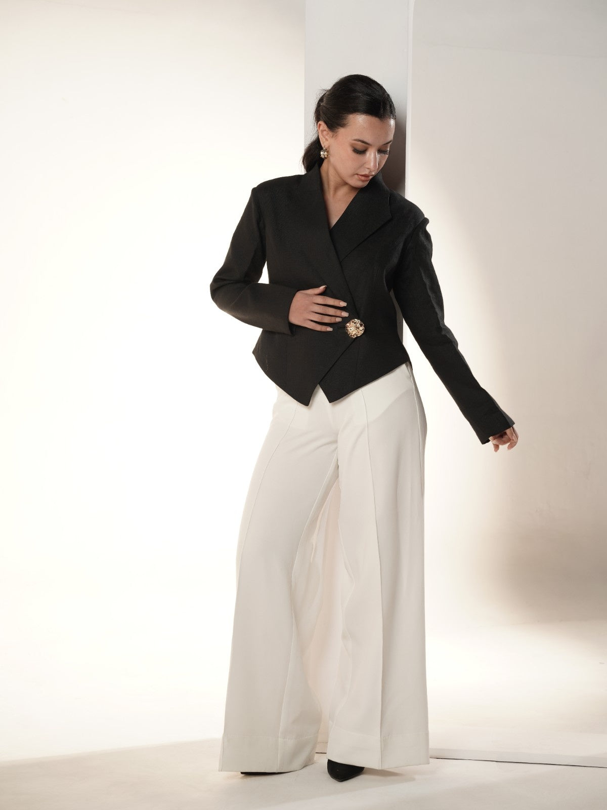 Arcadia blazer : Crafted in fine European linen, the Contour Crest Blazer redefines modern power dressing through sculpted structure and quiet luxury. The asymmetric fold-over front, emphasised by a single antique-gold couture button, creates a refined silhouette that moves with intention.