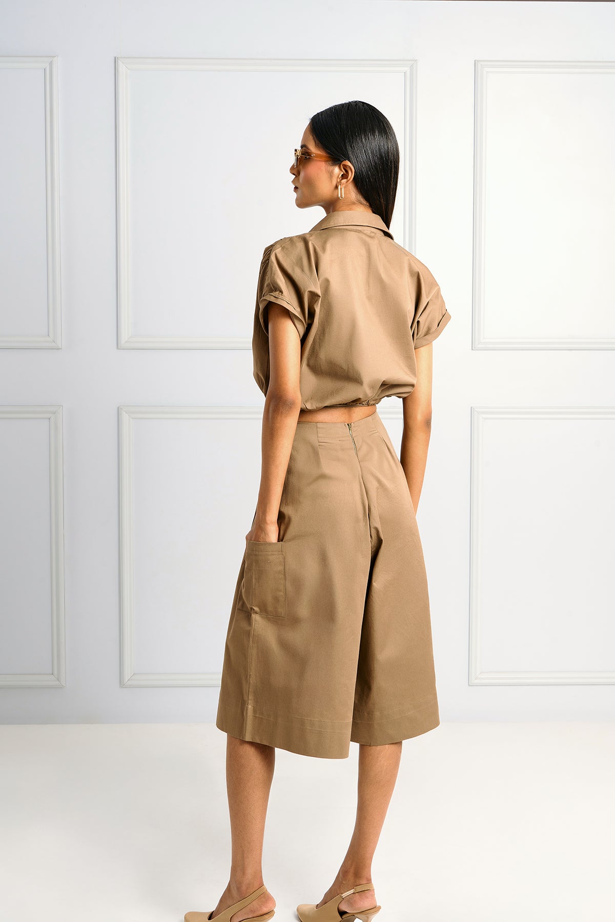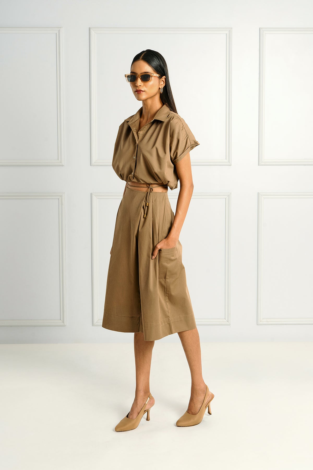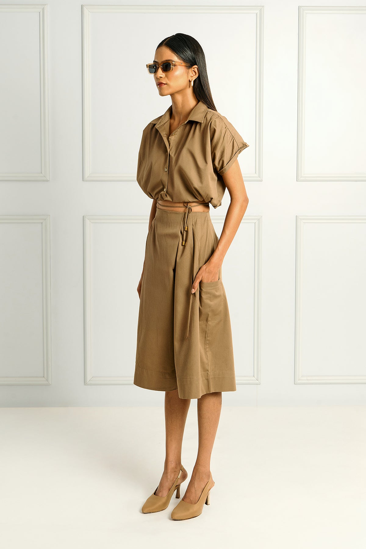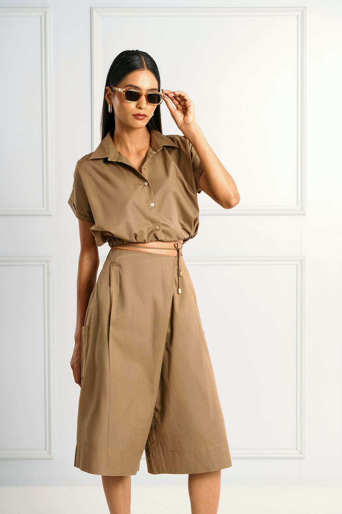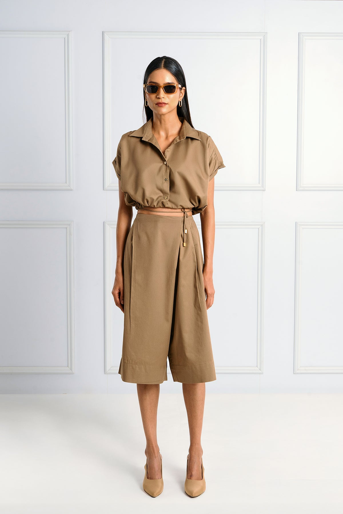 Where ease meets edge. The Terra Culottes feature a wrap-style silhouette in a rich tan cotton blend, offering sharp lines with effortless movement. Designed for the woman who moves through life with intention — breathable, versatile, and confidently undone.